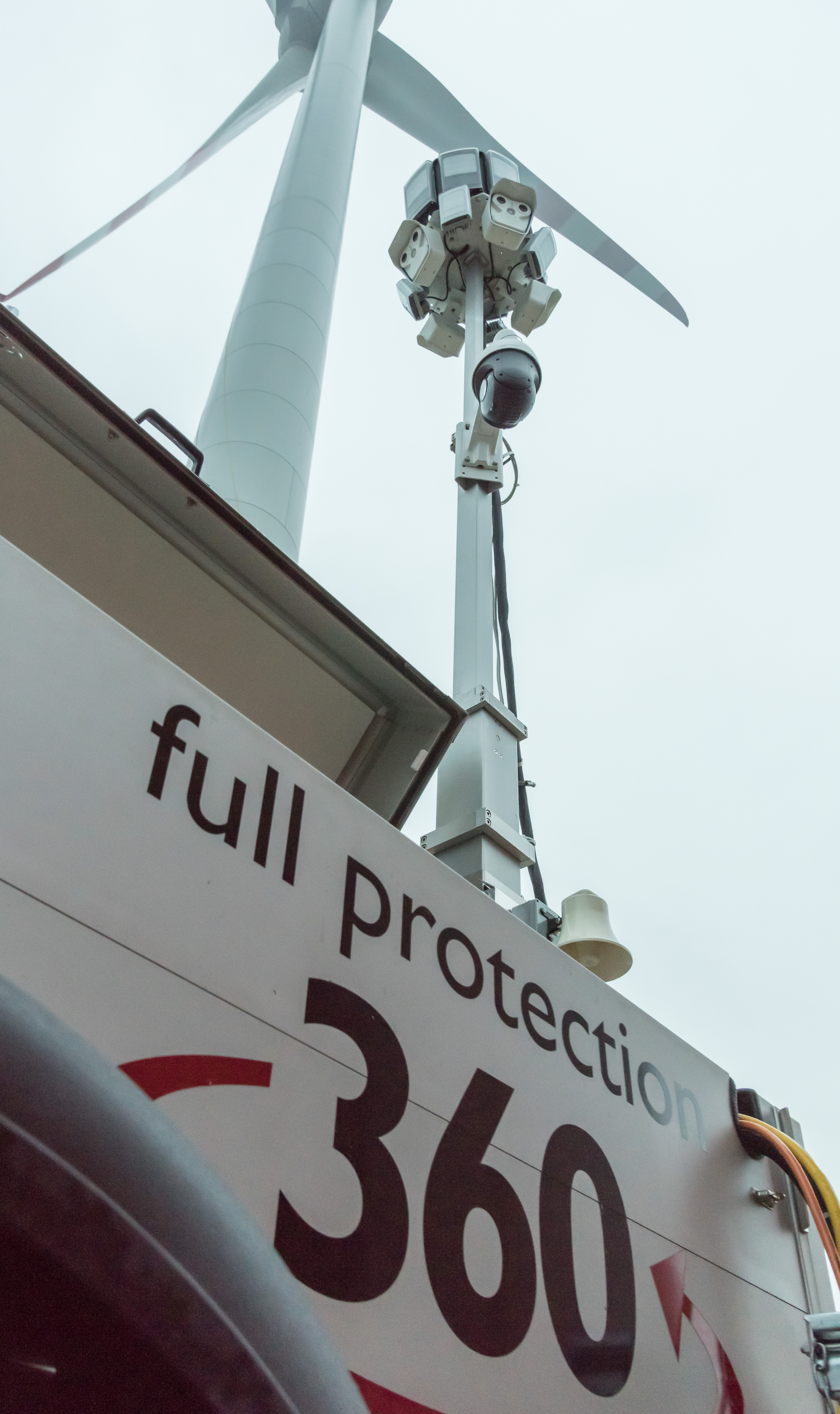Die mobile G4S „Full Protection 360°“-Lösung eignet sich am besten für offenstehende Areale – wie etwa Parkplätze, Baustellen, Betriebsgelände –, die in den Nachtstunden oder aufgrund von Umbauarbeiten temporär bewacht werden müssen. Das System lässt sich innerhalb einer Stunde aufstellen und scharfschalten und ist ab einer Mindestmietdauer von drei Monaten verfügbar. Mit einem System lassen sich – je nach Arealstruktur – bis zu 3.600 m² Fläche überwachen und dokumentieren. Installationskosten für Kameras und Material sind inkludiert, hinzukommen geringe einmalige Auf- bzw. Abbaukosten.