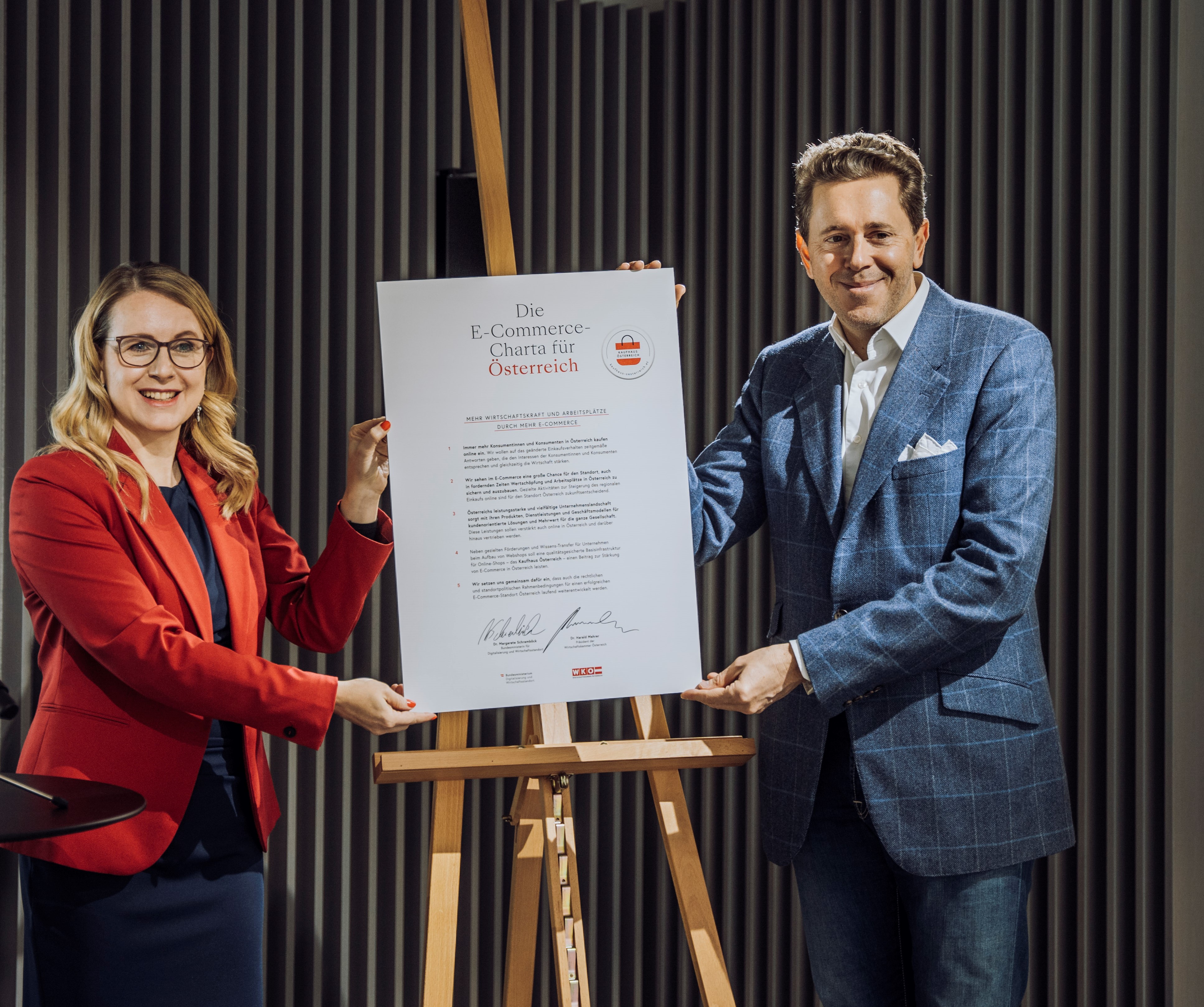 Gleichzeitig wurde von WKÖ-Präsident Harald Mahrer und Ministerin Margarete Schramböck die e-Commerce-Charta unterzeichnet. BMDW und WKÖ haben die Ziele des Kaufhaus Österreich in einer Charta festgehalten. Darin bekennen sich die Partner und Unterstützer von Kaufhaus Österreich zu: Ausbau von E-Commerce in Österreich, Gezielter Mobilisierung von Betrieben für E-Commerce, Unterstützung und Beratung von Betrieben rund um E-Commerce, Verbesserung der Rahmenbedingungen für E-Commerce in Österreich.