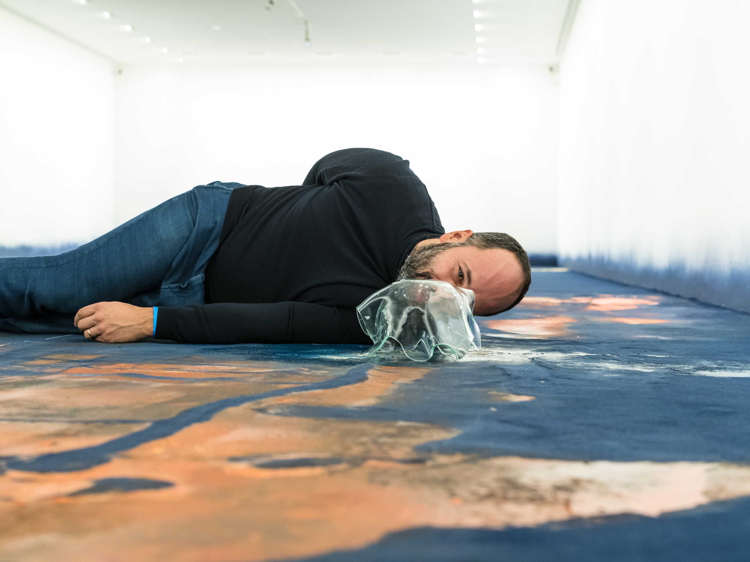 Hugo Canoilas verwandelt den Ausstellungsraum in eine betretbare Bühne der Malerei: Über die gesamte Bodenfläche zieht sich auf textilem Grund ein malerisches Szenario ineinander verfließender Formen mit quallenartigen und tentakulären Farbwesen aus Wolle und Glas. In Zeiten der Coronakrise, die das Social Distancing zum neuen Überlebensprinzip erhoben hat, sieht man sich in eine unentrinnbare malerische Biosphäre einbezogen, in der Verführerisches und Bedrohliches, Organisches und Technoides zugleich aufscheinen. Denn der Blick von oben auf die Malerei darunter weckt auch Erinnerungen an digitale Landschaftsszenarien, die wie aus der Perspektive einer Drohne aufgenommen sind. Gegen eine Weltordnung mit hierarchischen Wertestrukturen mahnt Canoilas den einfühlsamen Umgang des Menschen mit der Natur und allem Kreatürlichen ein. Davon zeugt auch die von Elise Lammer und Julie Monot auf Einladung des Künstlers entwickelte Performance „BECOMING DOG“, die von Zeit zu Zeit im Ausstellungsraum stattfindet.  Sie stellt das hierarchische Verhältnis zwischen Mensch und Tier durch das Prinzip der Empathie in einem institutionellen Raum in Frage.