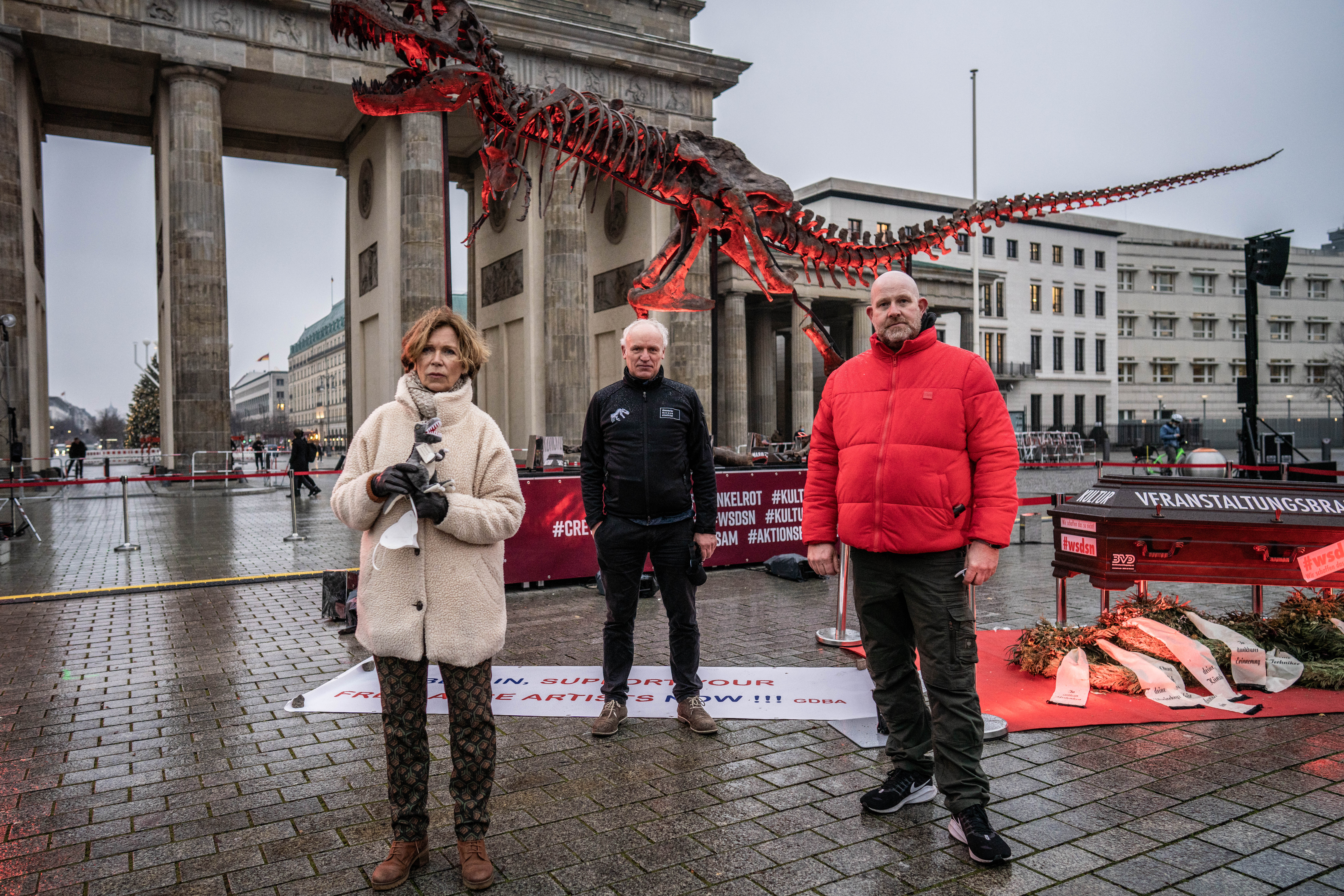 Mit einem 67 Millionen Jahre alten original T-Rex-Skelett aus dem Dinosaurier-Museum Altmühltal (Bayern) hat heute das Aktionsbündnis #AlarmstufeDunkelrot auf die existenziell dramatische Lage von Millionen Menschen aus den Bereichen Kunst und Kultur, Gastronomie und Hotellerie, Veranstaltungen und Messen, Tourismus, Freizeitindustrie und Museen aufmerksam gemacht. Es handelt sich dabei um etwa 10% aller Beschäftigungsverhältnisse in Deutschland.