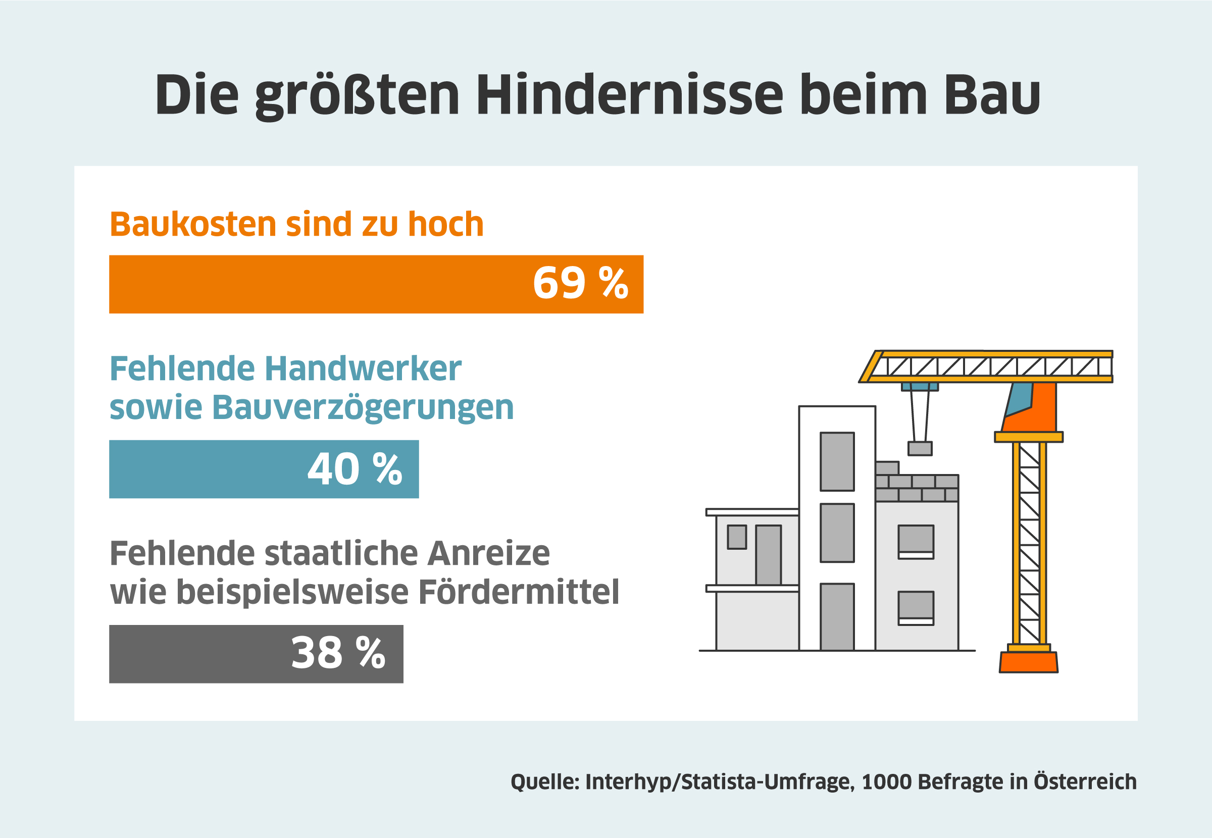 Doch unabhängig von Corona-Effekten sehen viele Österreicher seit längerem diese Probleme und Herausforderungen. Das zeigt ein Vergleich der jüngsten Befragung mit den März-Zahlen. Denn auch damals standen die zu hohen Baukosten für gut sieben von zehn Befragten (69 Prozent) auf dem ersten Platz der Hindernisse. Auf dem zweiten Platz folgten auch damals mit zwei Prozentpunkten weniger die fehlenden Handwerker und dadurch entstehende Verzögerungen beim Bau (38 Prozent). Auf dem dritten Platz landeten wie aktuell die mangelnden staatlichen Anreize für knapp vier von zehn Befragten (38 Prozent). Fehlendes Bauland war im März für 35 Prozent der Befragten das größte Bauhindernis. Angesichts steigender Preise, des Fachkräftemangels und der geringen Eigentumsquote sorgen sich laut Statista 70 Prozent um den Immobilienmarkt.