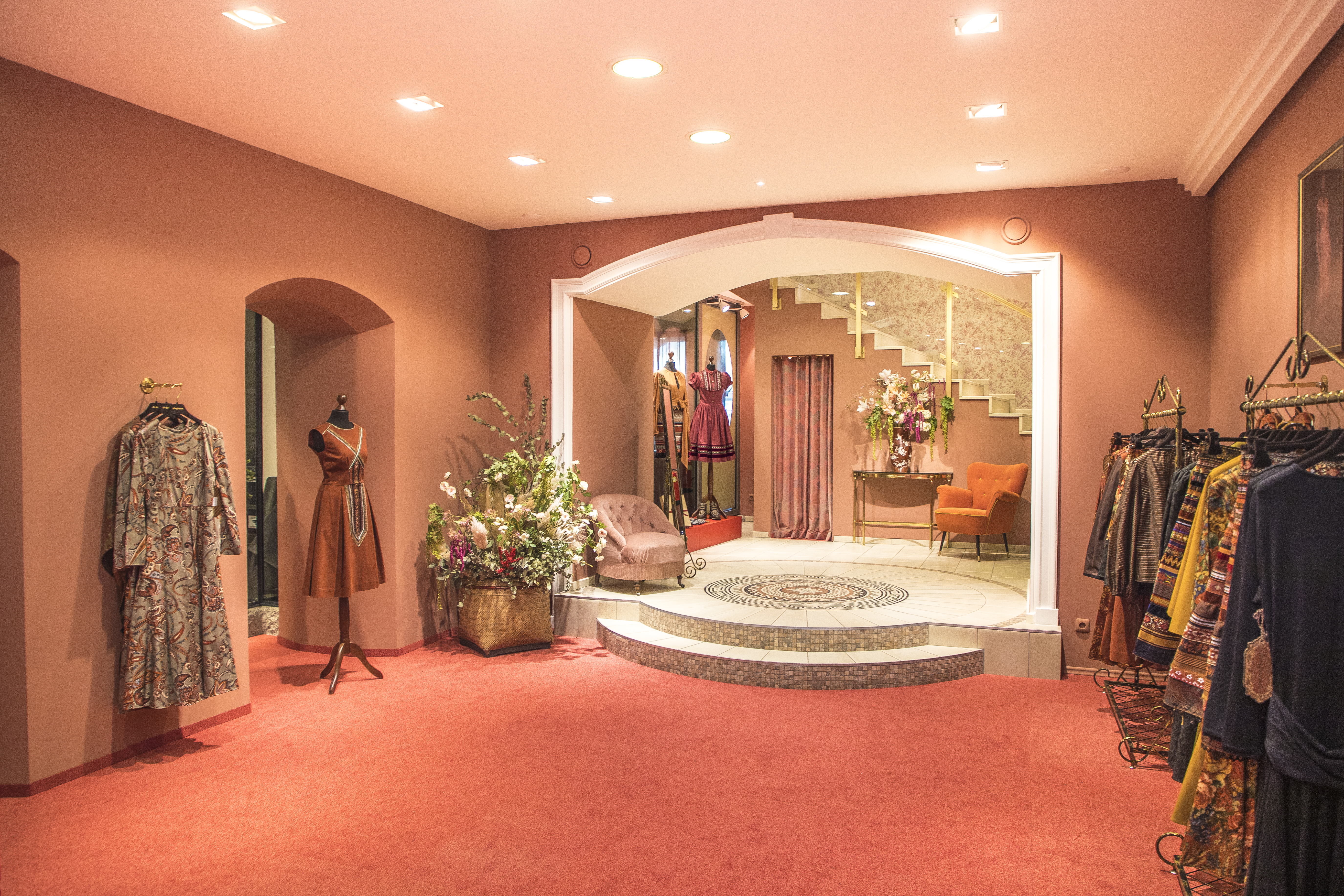 Sobald man den Shop betritt, spürt man mit welch liebevoller Sorgfalt das Interieur verlesen wurde. So ist es gelungen, auf rund 170m² Geschäftsfläche eine Welt zu schaffen, die mehr Lena Hoschek nicht sein könnte. Erarbeitet wurde ein völlig neues Farb- und Interieur-Konzept. Stilvolles Altrosa ziert die opulenten Vorhänge, frisches Grün schmückt die hohen Wände und trifft auf lieblich-elegante Blumenmuster-Tapeten, einzigartige Vintage Möbel fügen sich harmonisch ins glamouröse Ambiente ein.