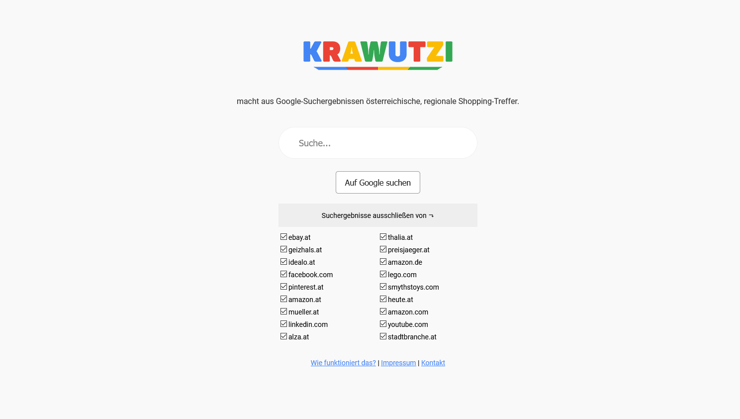 Ein Test mit Suchbegriffen wie "Lego" oder "Schmuck" zeigt, dass es funktioniert. Während bei der normalen Google-Suche Rankings der großen Onlinehandelsriesen wie Amazon & Co. oder LEGO.com die vordersten Plätze dominieren, bringt eine Suche mit krawutzi.at regionale Shops wie brickstore.at oder iripro.at unter die TOP 3 Rankings nach vorne.