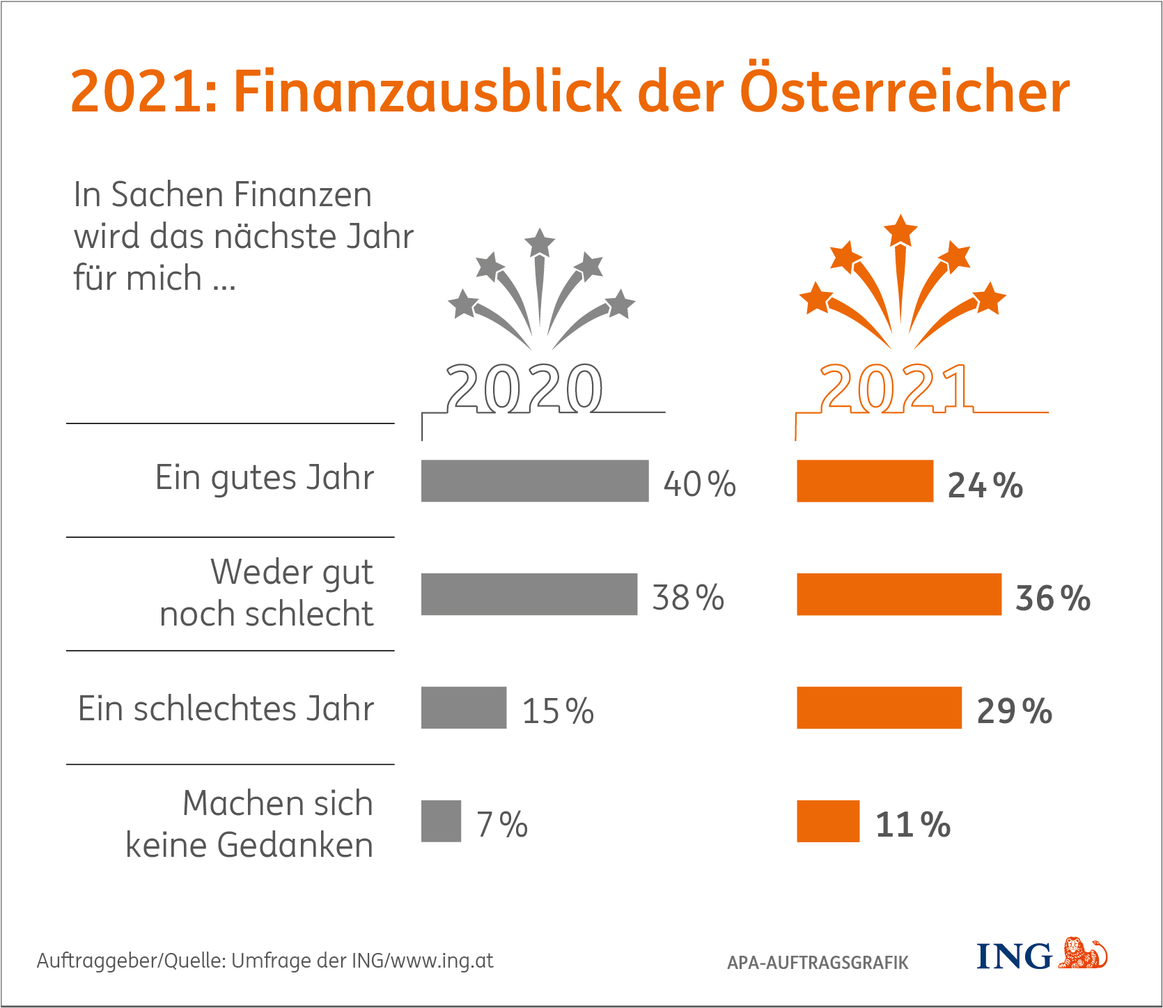 Die Umfrage der ING (www.ing.at) zu den persönlichen Finanzaussichten und den Finanzvorsätzen für das kommende Jahr wurde heuer wiederholt. Wie aufgrund der Pandemie kaum anders zu erwarten, gab es eine massive Umkehr: Sehr viel weniger Österreicher berichten von rosigen Aussichten und für sehr viele mehr ist der Blick auf ihre Finanzen im Jahr 2021 bedrückend.