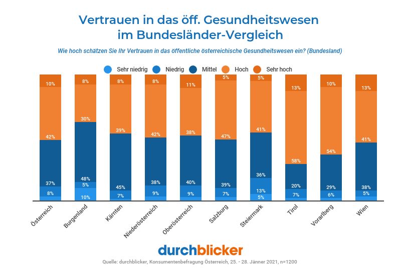 Unter den Burgenländern haben sogar 57 Prozent der Befragten einen Vertrauensverlust erlebt. Auch Oberösterreich weist mit 48 Prozent einen hohen Wert auf. Am geringsten fällt der Vertrauensverlust dagegen in Tirol (26 Prozent gesunkenes Vertrauen vs. 64 Prozent unverändert) und Vorarlberg (29 Prozent vs. 65 Prozent) aus. Die Bundeshauptstadt liegt ungefähr im österreichweiten Schnitt: Bei 35 Prozent der Wienerinnen und Wiener ist das Vertrauen ins Gesundheitssystem gesunken, bei 58 Prozent gibt es keine Veränderung.