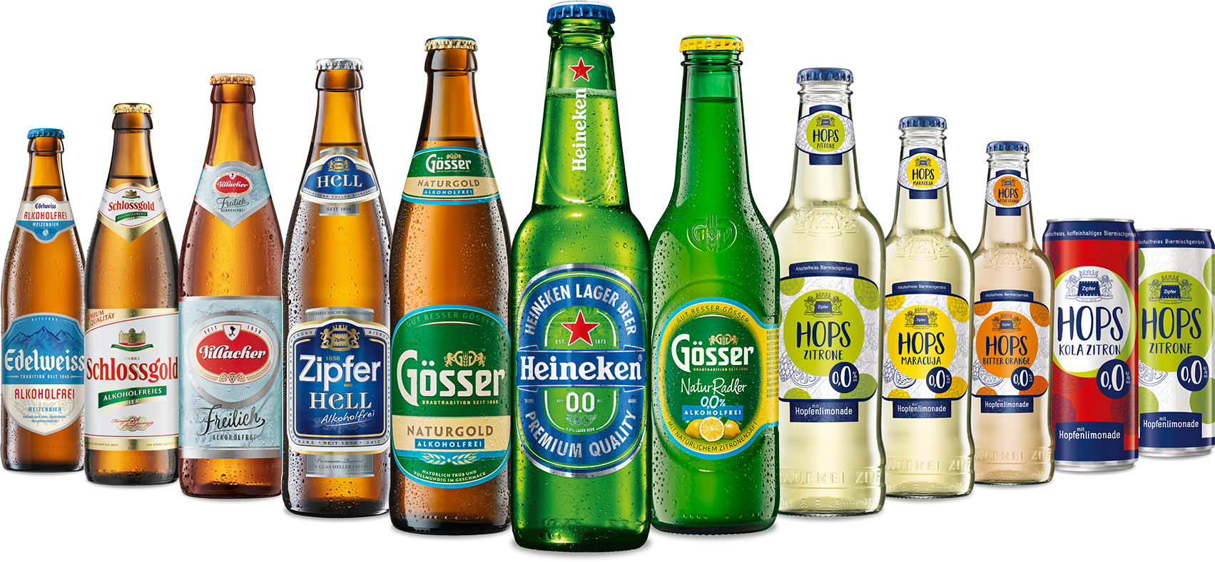 Erfreulicherweise bedeutet der Alkoholverzicht aber nicht, dass auch der Biergenuss ausbleiben muss. Denn der ist auch natürlich alkoholfrei möglich mit einer geschmacklichen Biervielfalt: Gösser NaturGold Alkoholfrei, Heineken 0,0, Zipfer Hell Alkoholfrei, Schlossgold, Villacher Freilich Alkoholfrei und Weizenbier Edelweiss Alkoholfrei.