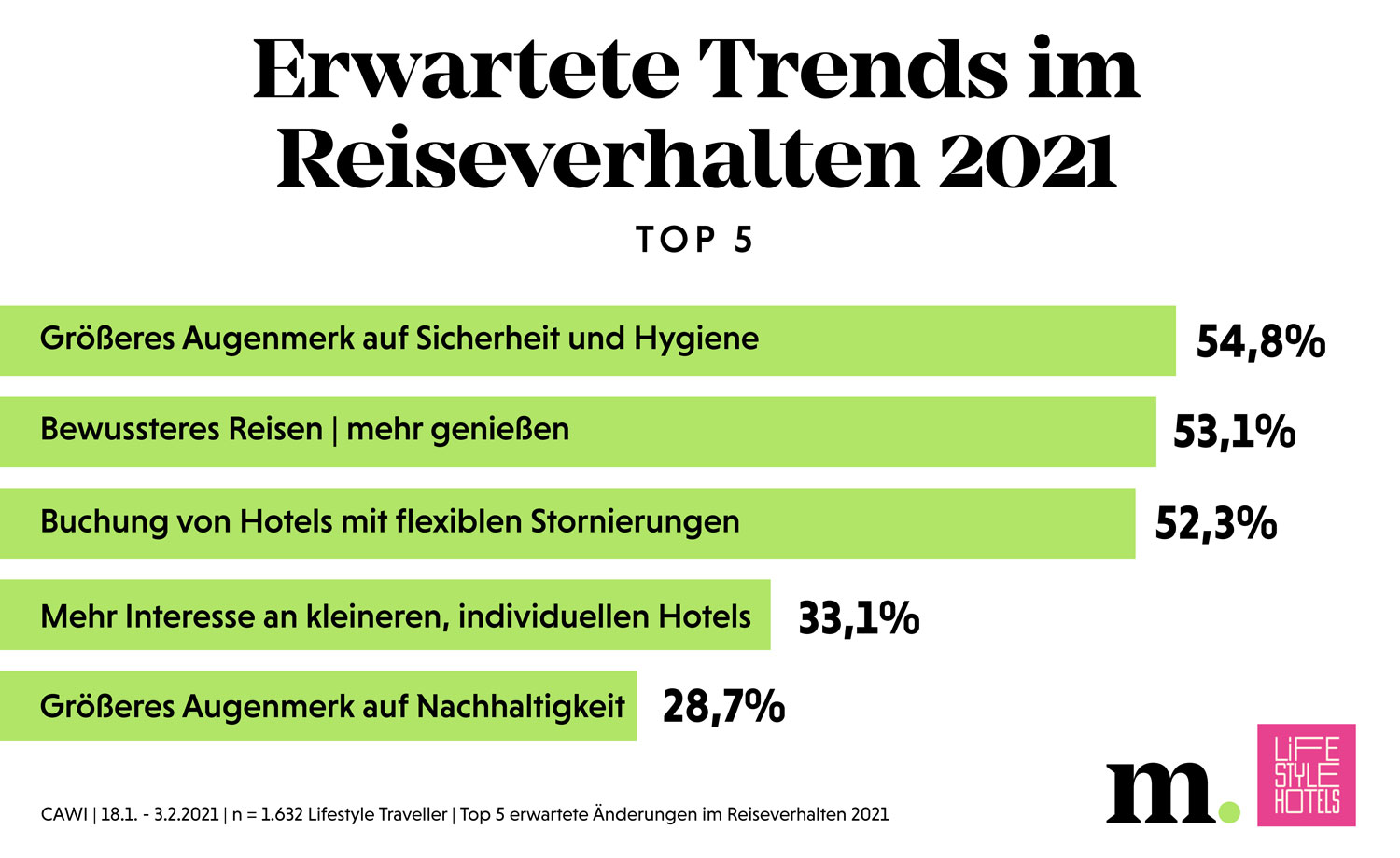 Doch Corona könnte weitaus größere Auswirkungen auf die Urlaubsgestaltung haben. „Für das Jahr 2021 werden als Folge der Pandemie einige Trends im Reiseverhalten erwartet: Je mehr als die Hälfte der Befragten rechnet mit einem größeren Augenmerk auf Sicherheit und Hygiene (55%) und mehr Buchungen von Hotels, die flexible Stornierungen erlauben (52%). Ein Drittel sagt ein steigendes Interesse an kleineren, individuellen Pensionen und Hotels voraus. Doch auch bewussteres Reisen und Genießen des Urlaubs könnte sich laut gut jedem*r Zweiten zum Trend entwickeln“, beschreibt Marketagent-Marketingleiterin Lisa Patek. Covid-19 führte insgesamt bei drei Viertel der Befragten dazu, dass Reisen nicht mehr als selbstverständlich verstanden und die Möglichkeit mehr geschätzt wird. 7 von 10 möchten daher in Zukunft ihre Urlaube noch bewusster genießen und sich mehr gönnen.