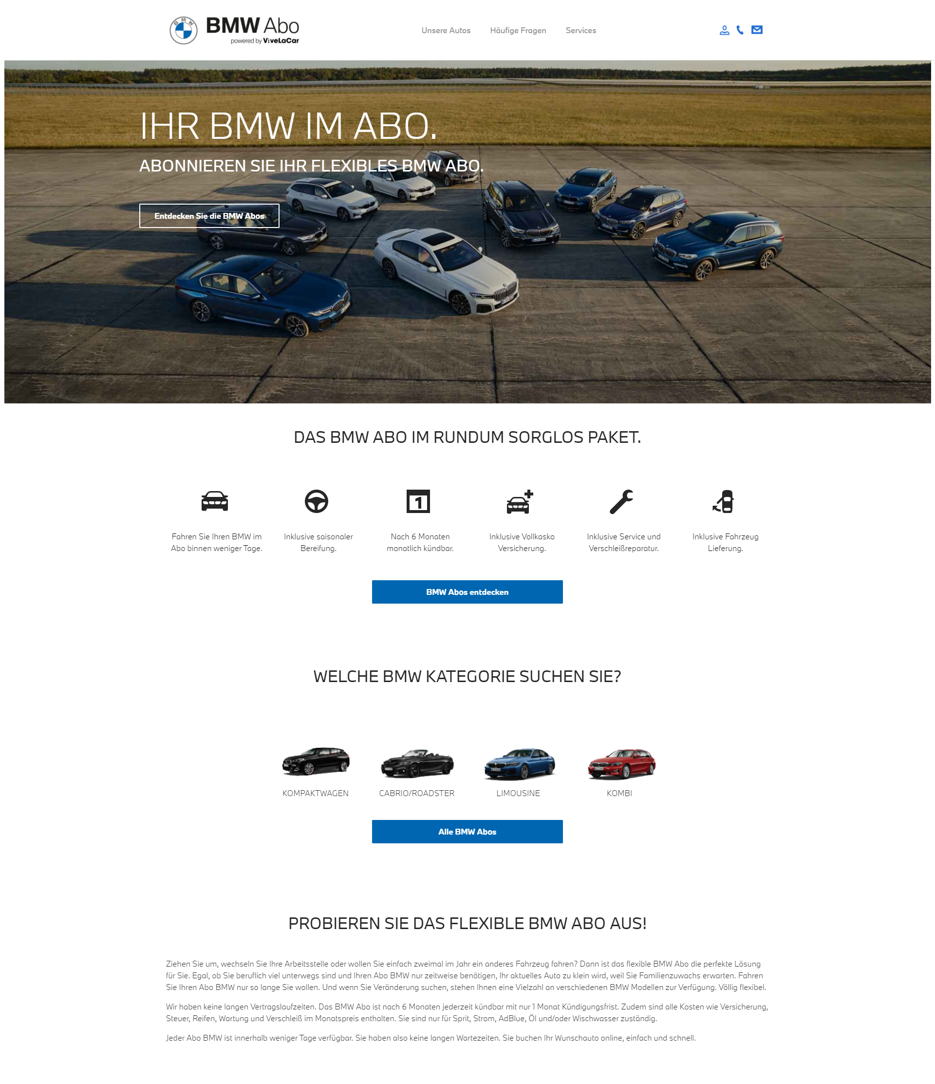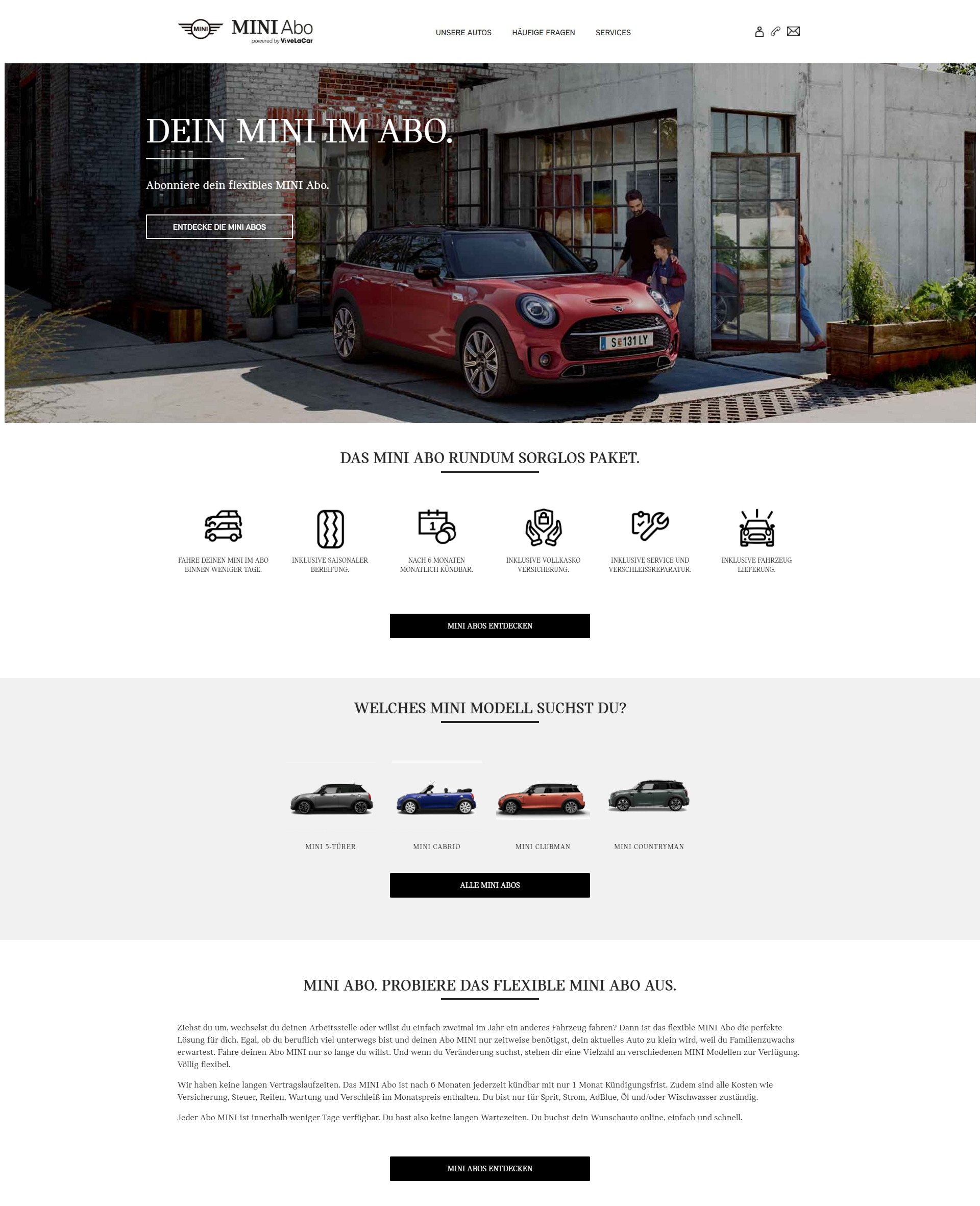 Das Abo ist eine besonders flexible und komfortable Möglichkeit, Premium-Mobilität in einer neuen Dimension zu erleben. Auf den beiden Online-Plattformen: https://www.bmw-abo.at/ und https://www.mini-abo.at/ werden verschiedene Modellreihen in unterschiedlicher Motorisierung und Ausstattungsumfängen angeboten.