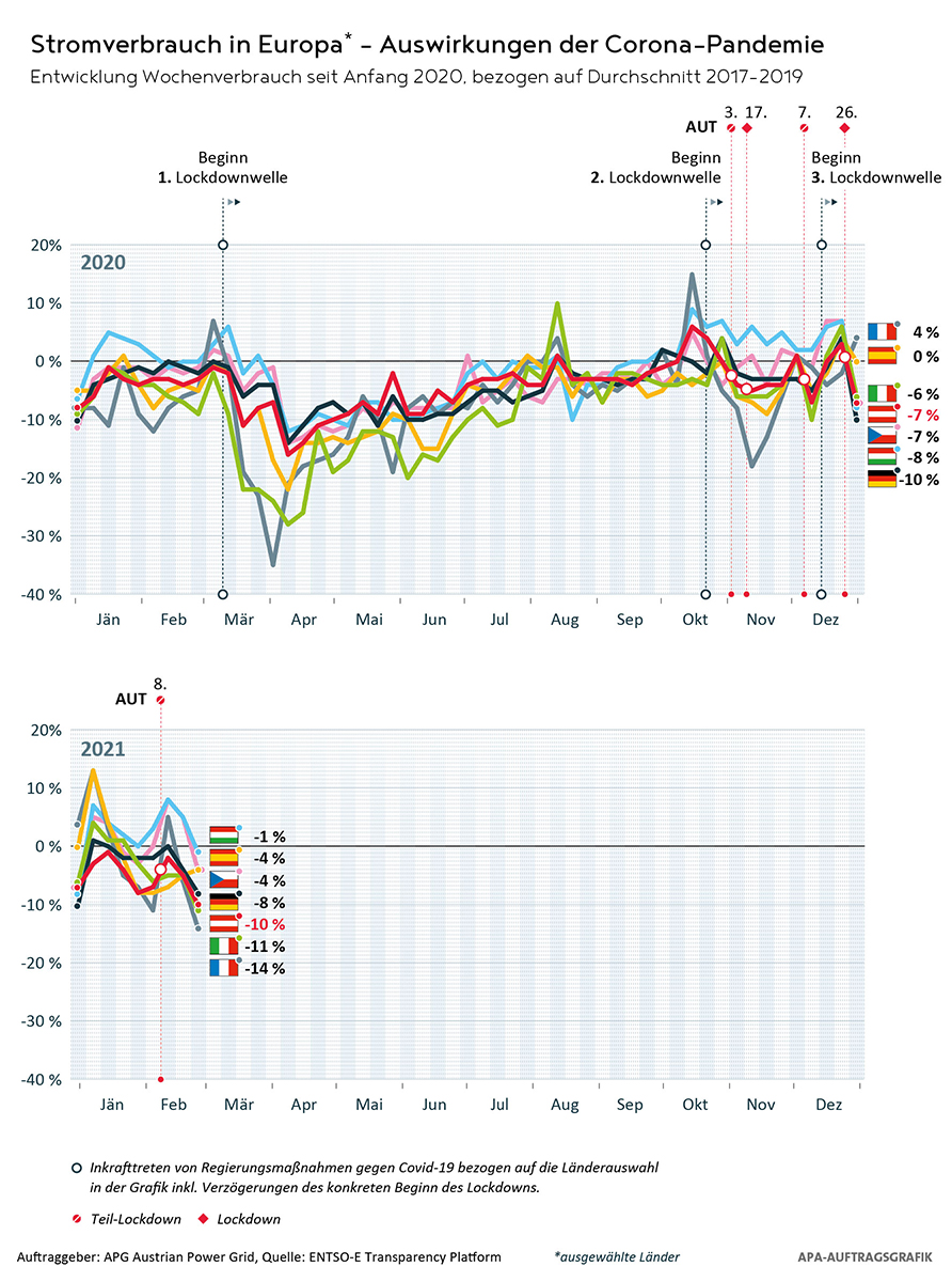 APG verfolgt die Entwicklung des Stromverbrauchs und anderer wesentlicher Daten im Stromsystem seit Beginn der Corona-Krise und veröffentlicht unter https://www.apg.at/infografiken regelmäßig Grafiken zu den Themen: Energieaustausch, Stromverbrauch Österreich, Stromverbrauch Europa, Import/Export, Strompreis u.v.a.m.