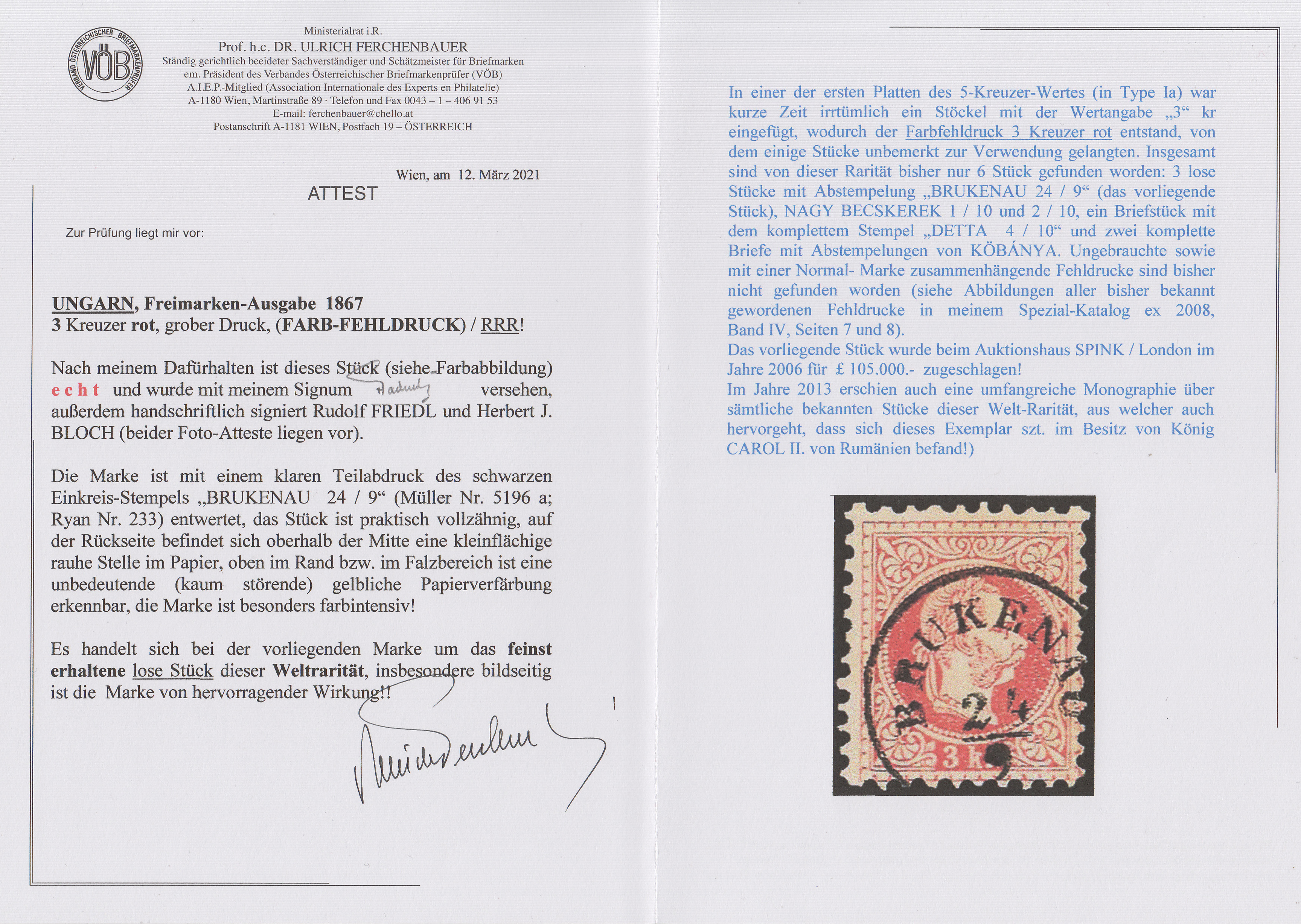Die fehlerhafte Herstellung der österreichisch-ungarischen 3 kr Marken in Rot anstatt Grün wurde sehr rasch bekannt und daher kamen nur wenige in Gebrauch. Nur 6 Stück sind bis auf den heutigen Tag erhalten, davon zwei Briefe. Das vorliegende ist das schönste und besterhaltene lose Stück. Es wurde in BRUKENAU, einem kleinen Dorf im Banat im ehemaligen Königreich Ungarn, gebraucht. Diese Ortschaft liegt heute in Rumänien.