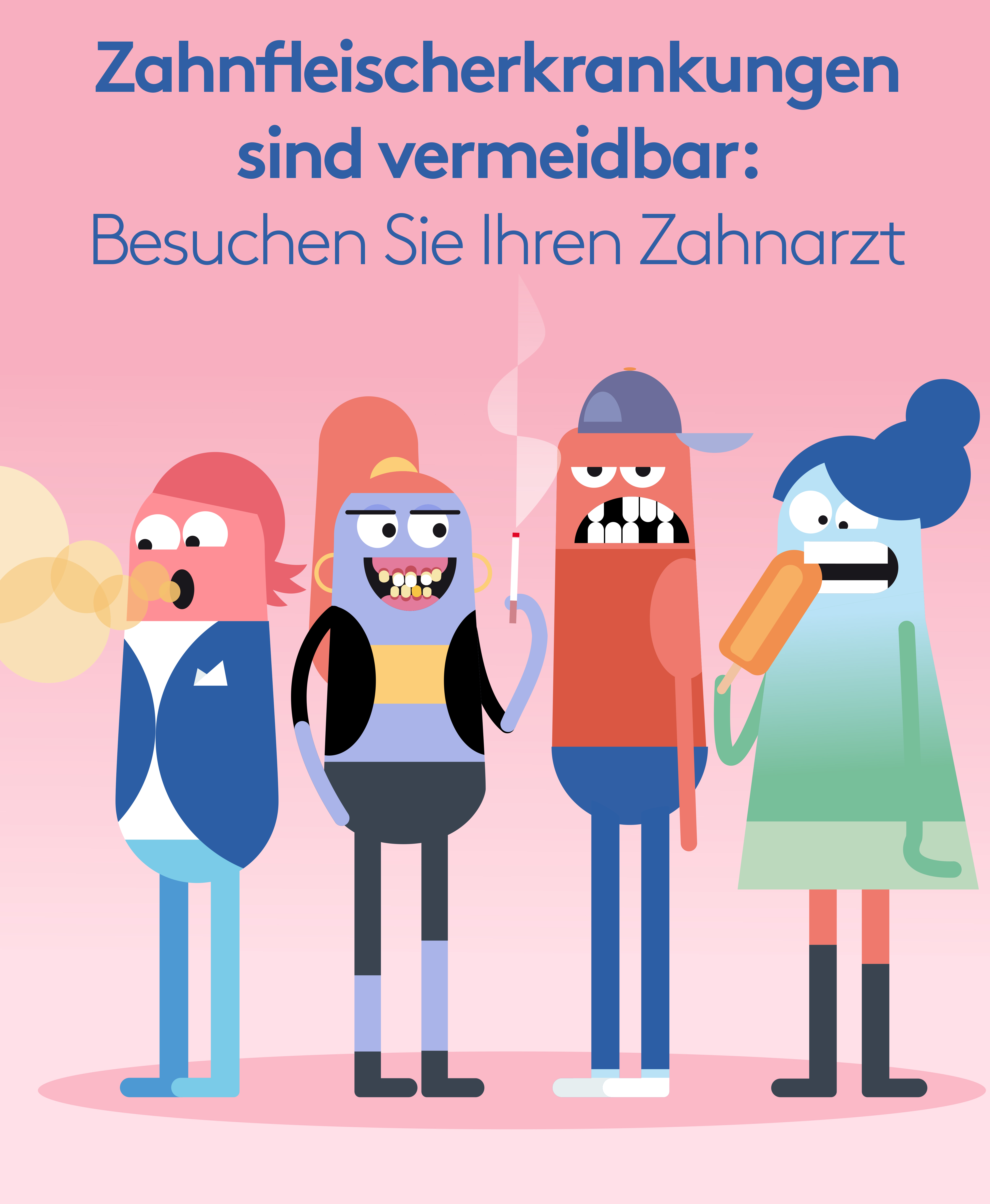 Diese vier „Symptome“ der Parodontitis können von den Patient*innen selbst wahrgenommen werden und benötigen keine großartigen, zahnmedizinischen Diagnosen. Mit humorvollen Cartoon-Videos anlässlich des GHD 2021 soll darauf aufmerksam gemacht werden.