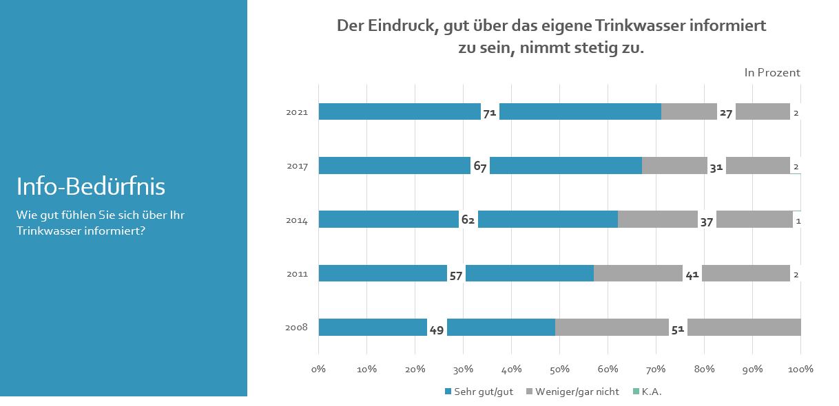 Über die Hälfte der Befragten hat Bedenken, dass die Trinkwasserqualität oder -versorgung durch Klimaerwärmung und Umweltverschmutzung in Zukunft schlechter werden könnte. Auch die Gefährdung der Trinkwasserversorgung aus der Leitung durch eine Krise wie etwa eine Pandemie oder ein Black-Out sehen 55 % der Befragten als möglich an. 95 % ist der Schutz von Quell- und Grundwasser sehr wichtig und rund ein Drittel denkt, dass hier von öffentlichen Stellen noch nicht genug getan wird. „Im Sinne der Konsumentinnen und Konsumenten setzen wir uns bei nationalen und internationalen Gesetzgebern daher klar für den Grundwasserschutz und die Versorgungssicherung mit hochqualitativem Trinkwasser ein