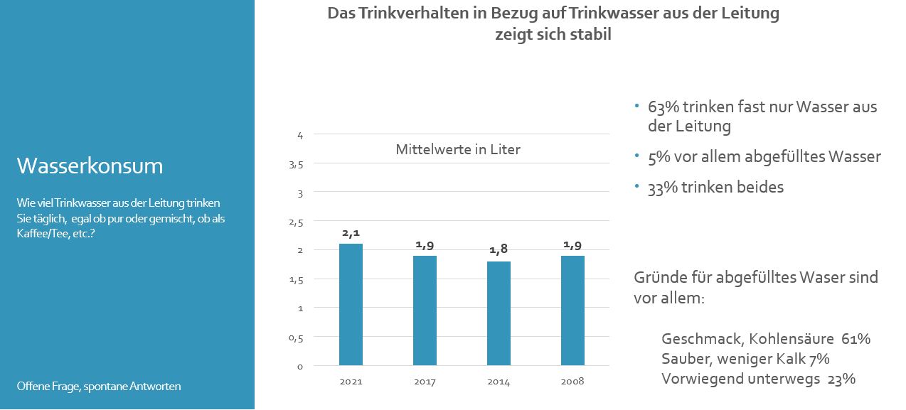 - Nutzung von Trinkwasser steigt: Im Durchschnitt werden täglich 2,1 Liter Trinkwasser aus der Leitung getrunken; nur 5 % der Befragten geben an, überwiegend abgefülltes Wasser zu trinken