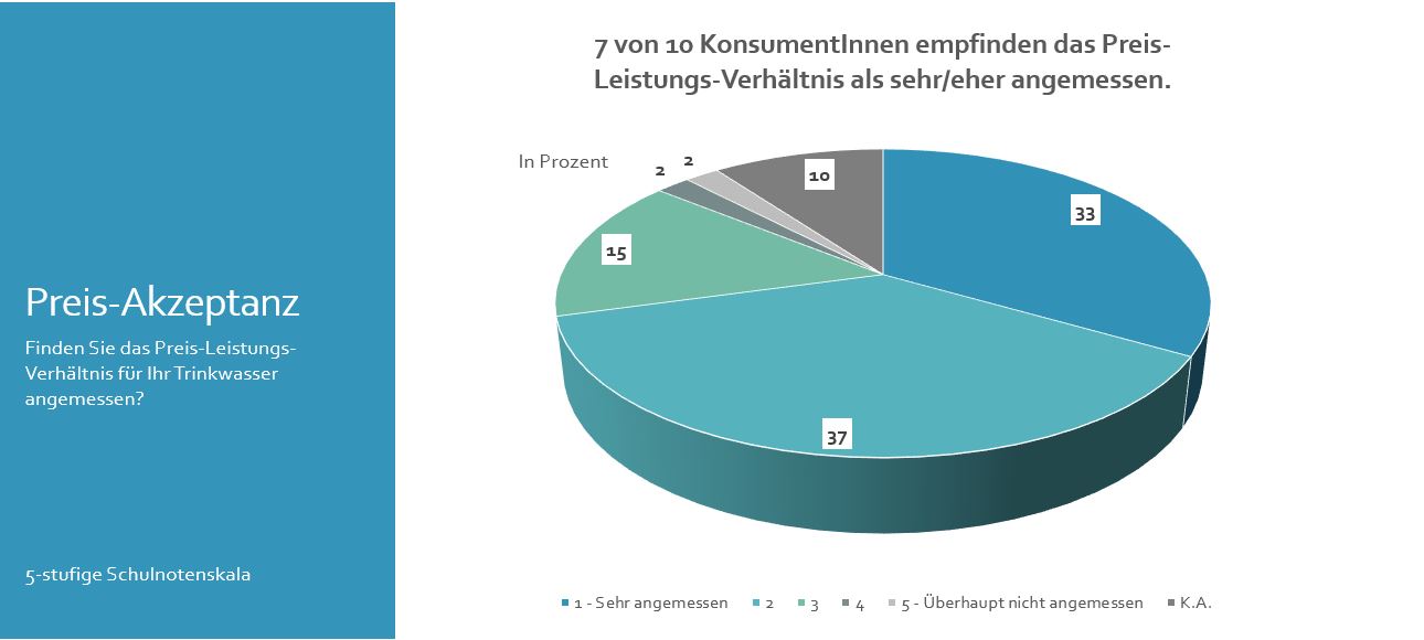 Rund 2 Liter Trinkwasser aus der Leitung trinken die Österreicherinnen und Österreicher täglich. Weit über die Hälfte der Befragten (63 %) gibt an, fast nur Trinkwasser aus der Leitung und kein abgefülltes Wasser zu trinken. Damit nutzen sie nicht nur eine vorhandene Ressource höchster Qualität, sondern leisten auch einen wichtigen Beitrag für mehr Nachhaltigkeit, da energie- und ressourcenintensive Verpackungen und Transporte entfallen. Das Preis-Leistungsverhältnis für Trinkwasser empfinden 70 % als sehr angemessen oder angemessen.