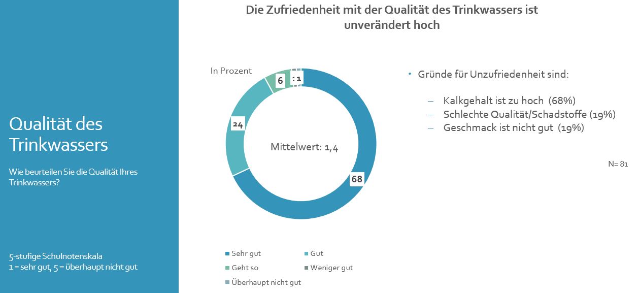 - Über 90 % beurteilen die Qualität des heimischen Trinkwassers mit sehr gut oder gut