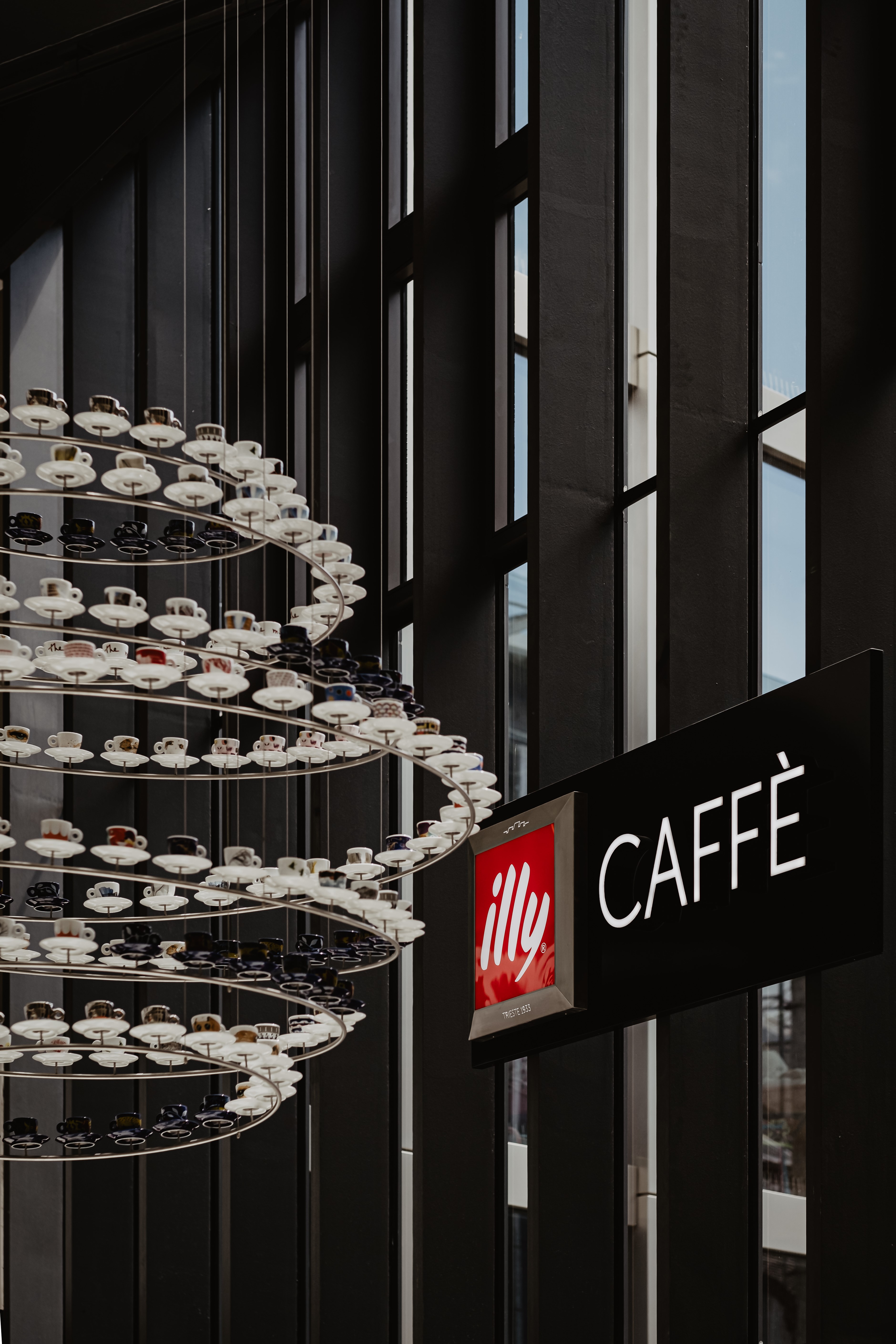 Der spektakuläre Kronleuchter, direkt an der Decke des Kaufhauses Tyrol, besteht aus ungefähr 100 illy Art Collection Tassen und wurde zum ersten Mal anlässlich des 10-jährigen Jubiläums der illy Art Collection hergestellt. Es symbolisiert eine Reise durch die Sammlungen berühmter zeitgenössischer Künstler und junger aufstrebender Künstler seit 1992. Die Kreise sind nicht perfekt parallel, um die Form einer Spirale nachzuahmen und den Eindruck des Weges von einer Tasse zur anderen zu erwecken.