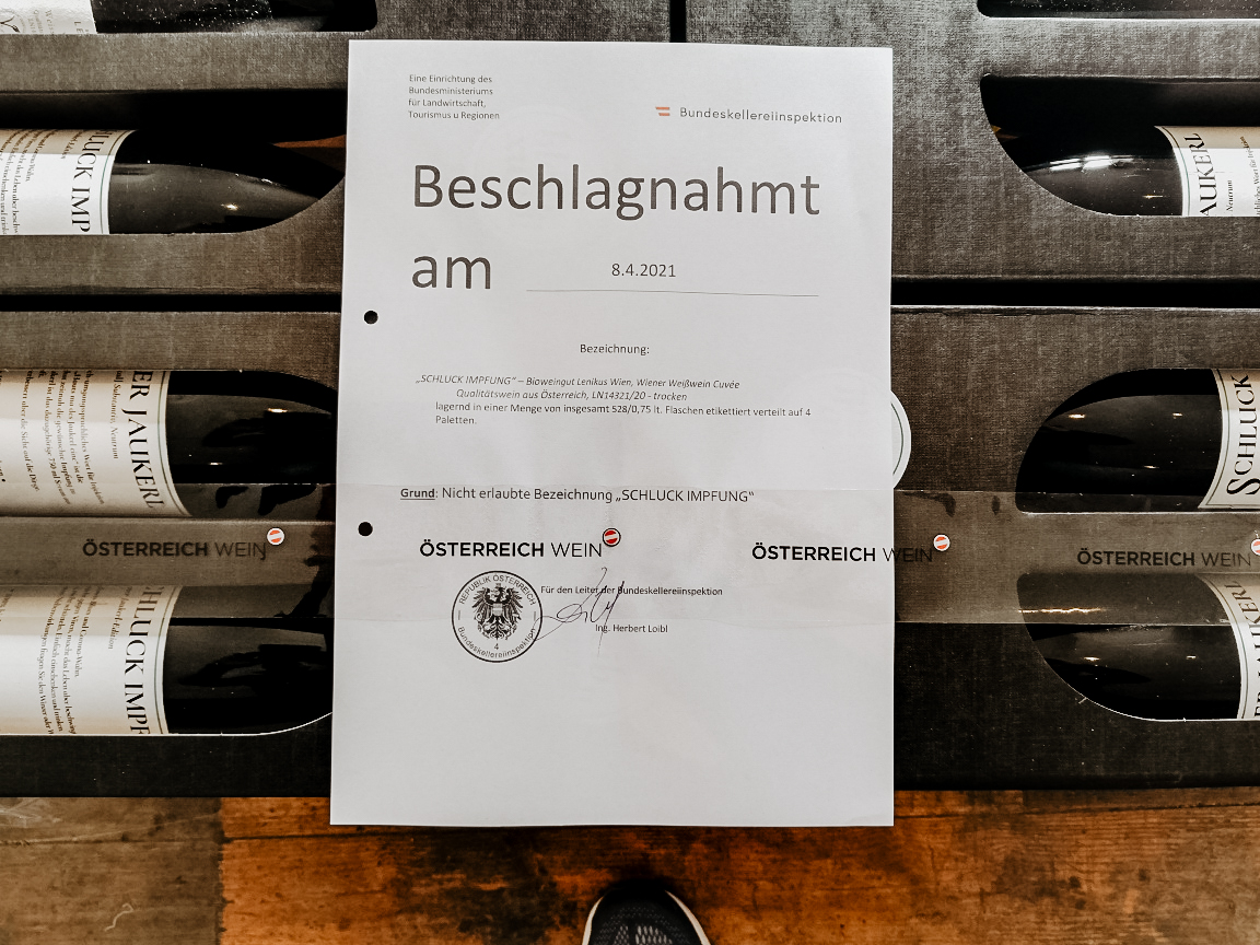 Auf Grund einer „gesundheitsbezogenen Angabe“ am Etikett der Schluck Impfung wurde Anfang April der gesamte Vorrat der Schluck Impfung des Bioweingut Lenikus beschlagnahmt. Infolgedessen hat das Bioweingut Lenikus nun, gemeinsam mit einer Wiener Anwaltskanzlei, Beschwerde bei der zuständigen Behörde eingereicht.