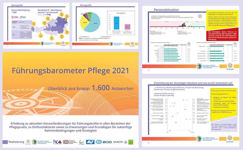 In den vergangenen Monaten hatten Führungskräfte in allen Settings der Pflegepraxis, verschärft durch die Corona-Pandemie, enorme Aufgaben zu bewältigen. Dies nahm das Karl Landsteiner Institut für Human Factors & Human Resources im Gesundheitswesen zum Anlass und führte im März und im April mit EUCUSA, dem Spezialisten für Feedbacksysteme, eine Befragung durch. Aus ganz Österreich füllten knapp 1.600 Führungskräfte aus der Pflegepraxis den Führungsbarometer Pflege 2021 aus. Der Fokus der Umfrage wurde auf die aktuelle Situation, Einflussfaktoren sowie Erwartungen gelegt. Diese Ergebnisse bieten Grundlagen für zukünftige Maßnahmen und Strategien im Bereich pflegerischer Handlungsfelder aus der Perspektive des Pflegemanagements.