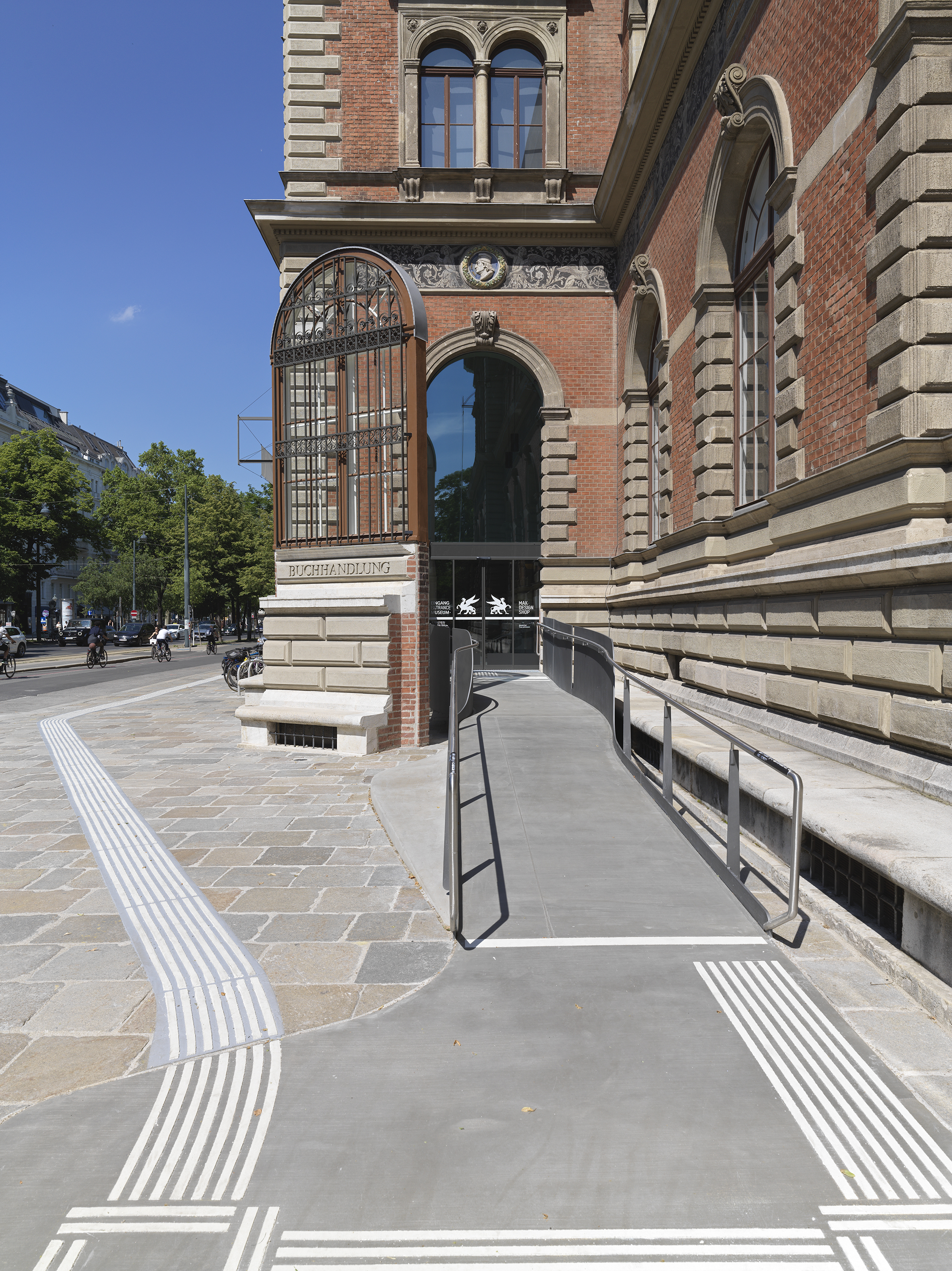 Seit Ende Mai 2021 verfügt das MAK über einen neuen, barrierefreien Zugang: Ein Rampenobjekt macht Menschen mit Einschränkungen das Museum nun direkt beim MAK-Haupteingang am Stubenring leichter zugänglich. Ohne Eingriff in die Außenfassade gelang der von der Burghauptmannschaft Österreich beauftragten Architektin Susanne Zottl in Zusammenarbeit mit Mag. arch. Daniel Kerbler eine Lösung, die sowohl hinsichtlich Inklusion als auch architektonischer Umsetzung und Ästhetik allen Anforderungen mehr als gerecht wird. „Die Zugangserleichterung für Menschen mit eingeschränkter Mobilität ist uns seit vielen Jahren ein großes Anliegen. Wir freuen uns sehr über diese neue verbindende Brücke in unser Museum, die das Haus allen Besucher*innen noch besser erschließen wird“, so Teresa Mitterlehner-Marchesani, wirtschaftliche Geschäftsführerin des MAK.