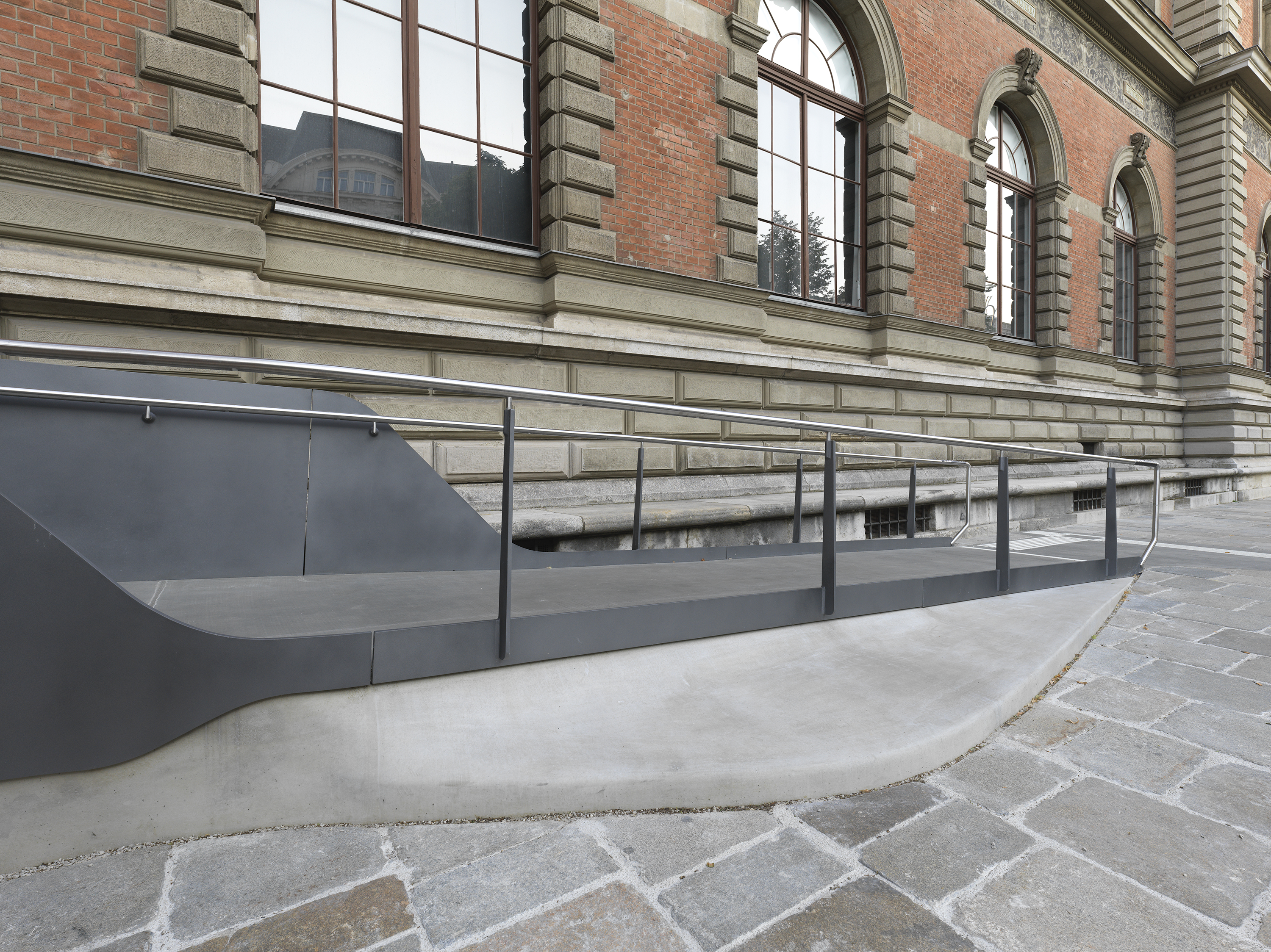 Der nun geschaffene barrierefreie Zugang stellt weit mehr als eine rein funktionale Lösung zur Überwindung der Stiege am Haupteingang dar. Susanne Zottl entwickelte ein Konzept, das auch den städtischen Raum vor dem Museum miteinbezieht. Der umgebende großzügige Gehsteig am Stubenring wurde in einer sanften Steigung angehoben und geht nun in ein Rampenobjekt über. Dieses führt in einer leichten Steigung zum bereits bestehenden Eingang des ehemaligen MAK-Bookshops hin. Gleich einem skulpturalen Objekt korrespondiert es mit dem Tor zum Ring (James Wines/SITE, 1992), das ein Stück Außenmauer physisch in den urbanen Raum hineinrückt.