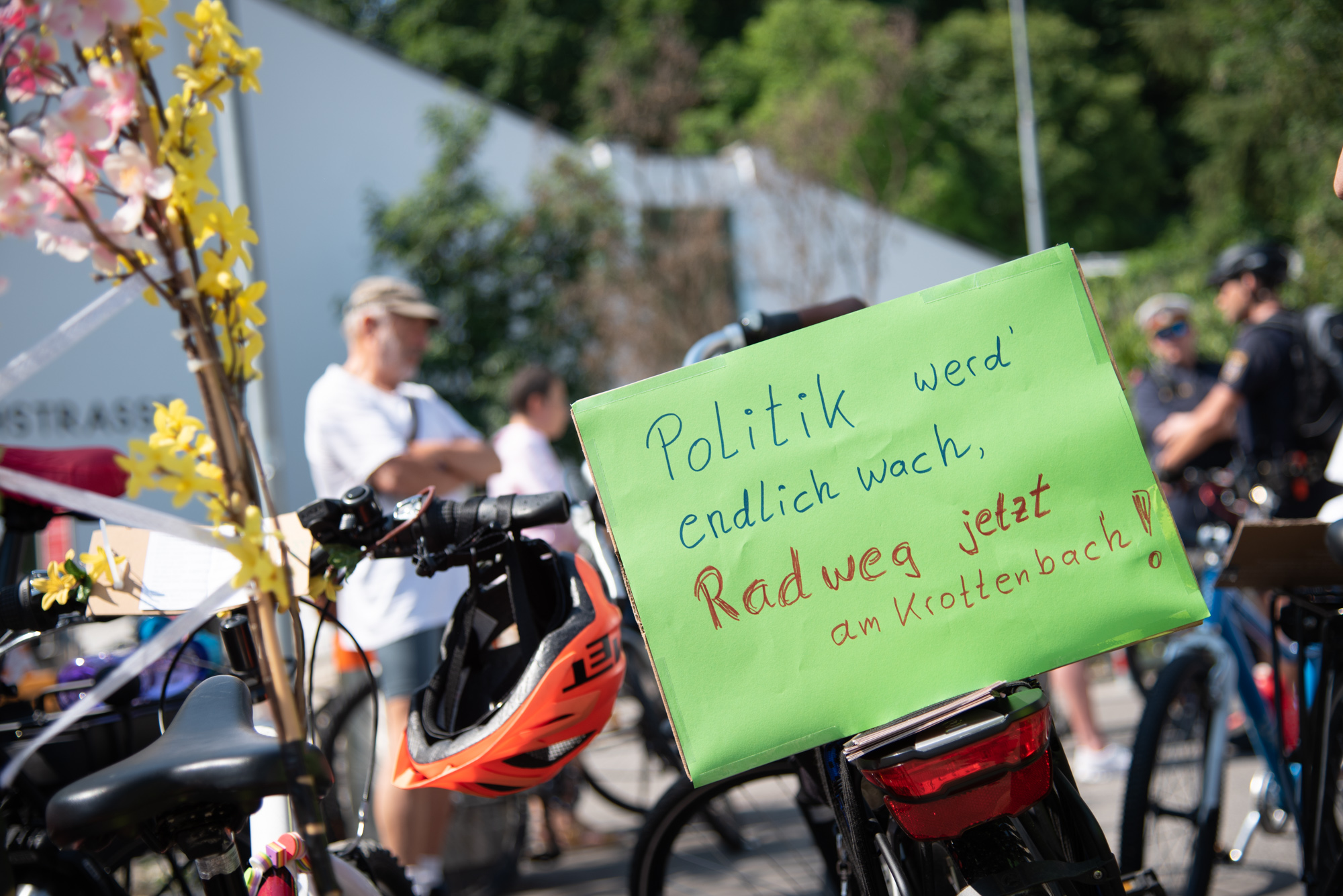 Trotz großer Hitze demonstrierten 250 Menschen für einen sicheren Radweg in der Krottenbachstraße. Nach erfolgreicher Petition ist nun die Politik gefordert endlich zu handeln.