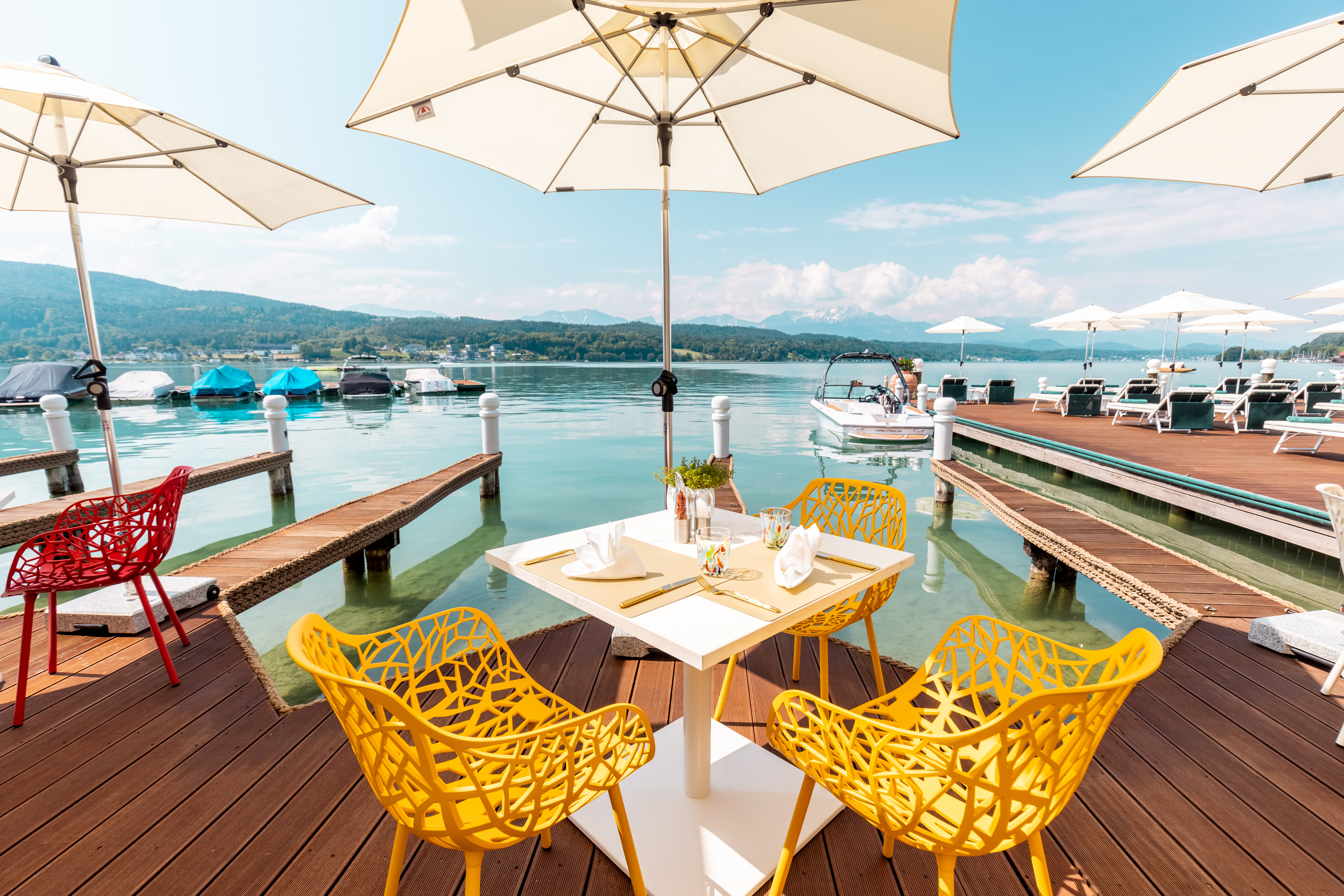 Platz nehmen die Gäste auf den Designer-Möbeln aus hochwertigem Material und höchstem Sitzkomfort: Wittmann in der Lounge, KFF an der Bar, Fast auf der Terrasse und Royal Botania auf den Logenplätzen. Wenn Helena Ramsbacher von diesen Plätzen auf der Beletage spricht, kommt sie ins Schwärmen und sagt: „Das ist der schönste Platz am See mit luftig-leichter Atmosphäre, avantgardistisch-coolem Ambiente und klassisch-kreativer Alpe-Adria-Küche mit hausgemachter Pasta, fangfrischen Wörtherseefischen und erstklassigem Valentino-Eis aus der Gelateria.“