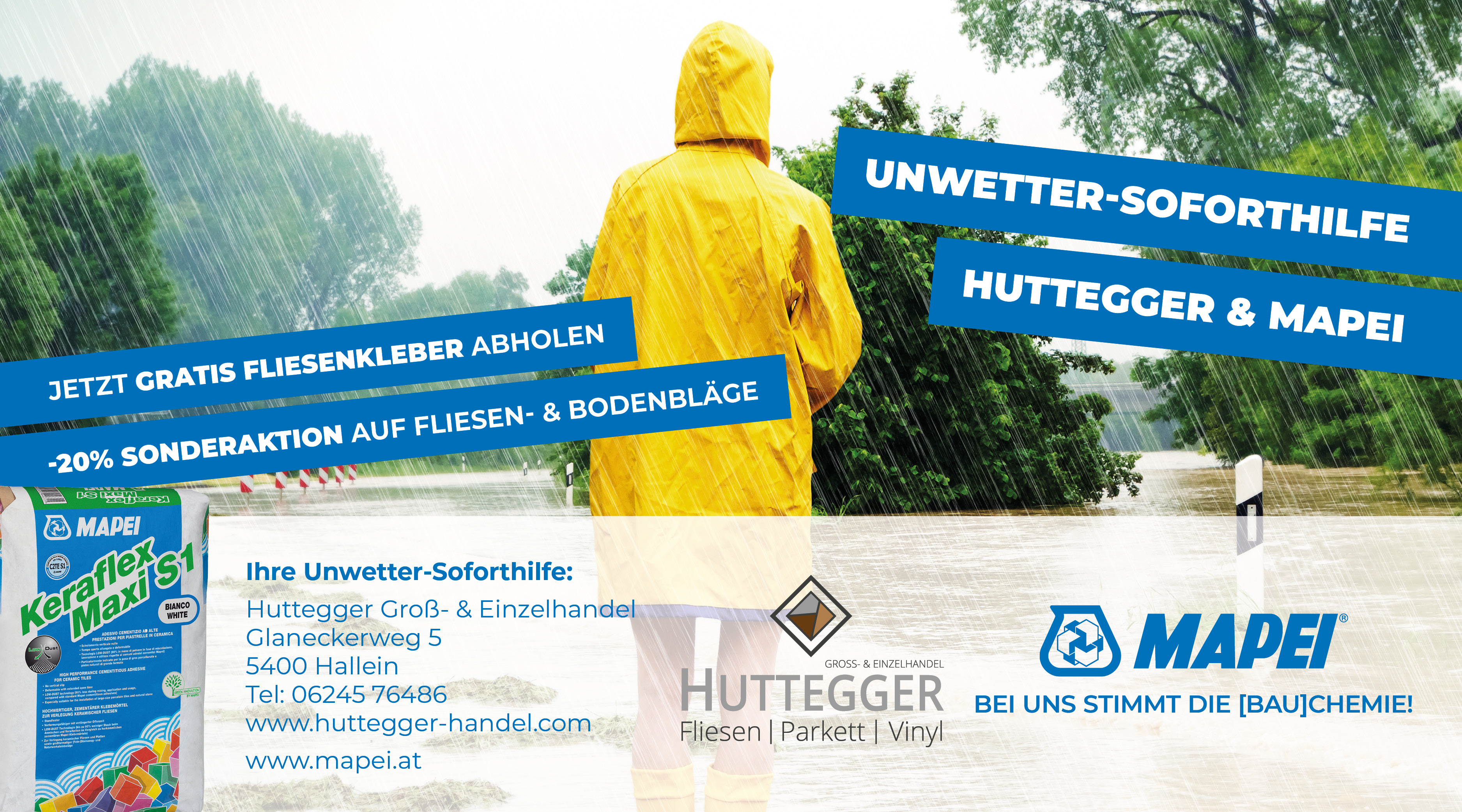 Soforthilfe für die Unwetter-Schäden bietet jetzt die Firma Huttegger, der regionale Spezialist in Hallein und Salzburg für Fliesen, Parkett und Vinyl, gemeinsam mit dem Partnerbetrieb MAPEI, dem Qualitätslieferanten für Bauchemie und Baustoffe.