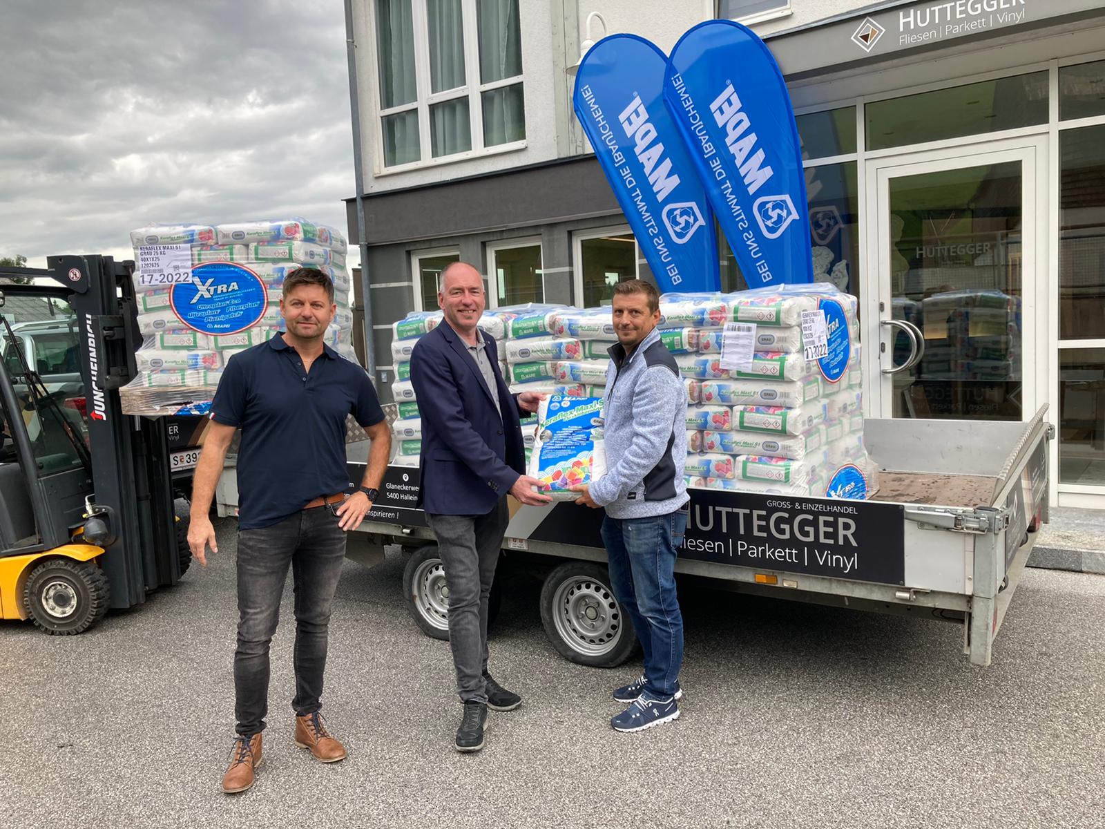 „Wir helfen dort, wo es jetzt am dringendsten benötigt wird und die Schäden von der Versicherung nicht entsprechend abgedeckt sind, mit dem kostenlosen MAPEI Fliesenkleber und Spezialaktionen“, erklärt Geschäftsführer Florian Huttegger. Bei Huttegger Handel gibt es jetzt den Fliesenkleber Keraflex Maxi S1 gratis als Soforthilfe, der von MAPEI kostenlos zur Verfügung gestellt wird. „Nur gemeinsam sind wir stark, besonders in herausfordernden Zeiten“, weiß Mag. Andreas Wolf, Geschäftsführer der MAPEI Austria GmbH, „Wir stellen dafür 4 Paletten des Fliesenklebers Keraflex Maxi S1 zur Verfügung, der schnell und unbürokratisch nach Vorlage der Bescheinigung, ausgestellt durch die Gemeinde Hallein, bei unserem Partner Firma Huttegger abgeholt werden kann“ so Wolf. Darüber hinaus gibt es auf alle Fliesen- und Bodenbeläge von Firma Huttegger Groß- & Einzelhandel für Fliesen, Parkett & Vinyl eine 20 Prozent Sonderaktion.