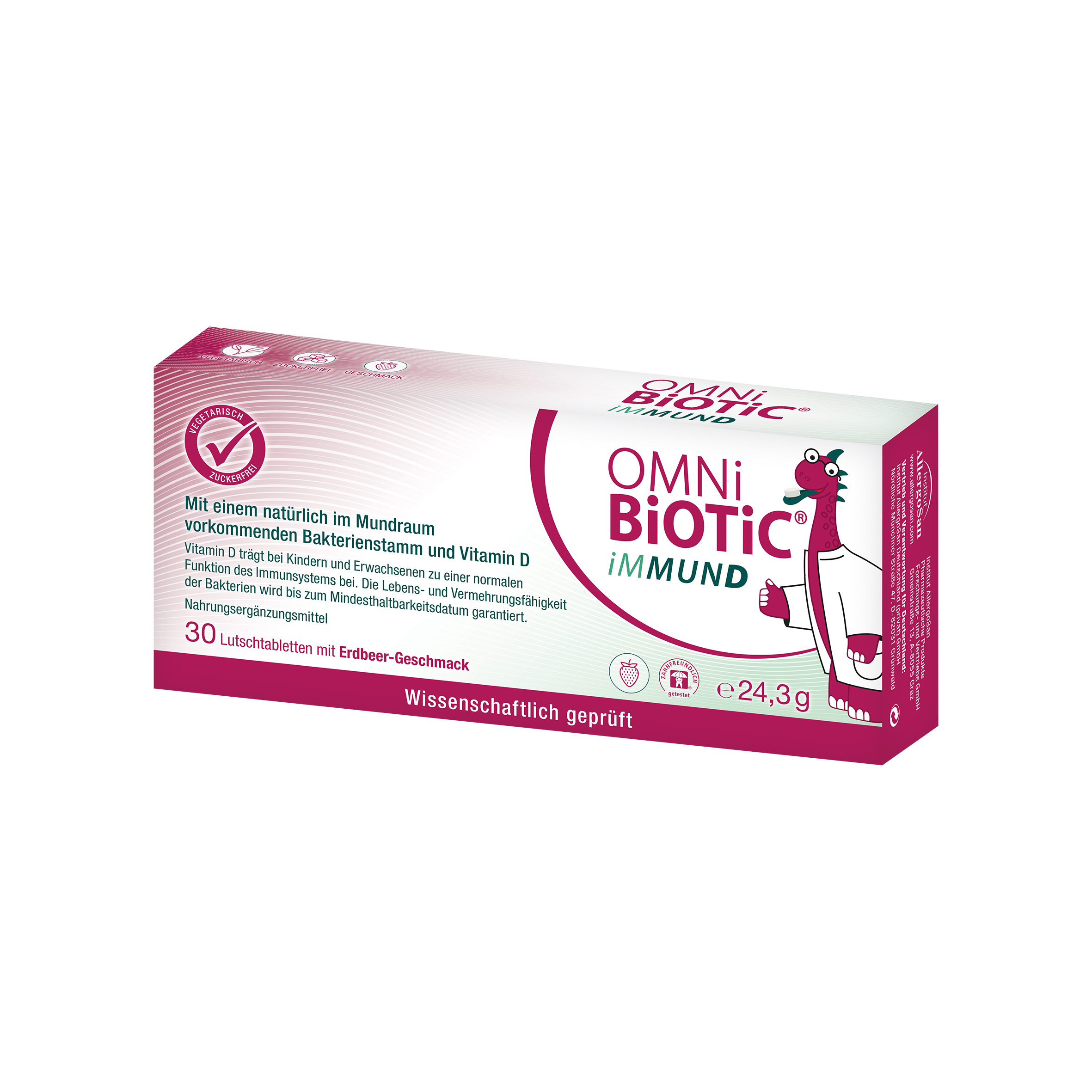 Speziell dafür wurde daher OMNi-BiOTiC® iMMUND entwickelt: Jede einzelne dieser innovativen Lutschtabletten enthält 1 Milliarde Keime von Streptococcus salivarius K12 – und durch das langsame Zergehen im Mund wird dieser wertvolle Leitkeimstamm direkt an seinem Bestimmungsort freigesetzt. Die kindgerechte, komplett zuckerfreie Formulierung – mit herrlich fruchtigem Erdbeergeschmack – lässt es zu, dass OMNi-BiOTiC® iMMUND tagtäglich für die Unterstützung von Mundflora und Abwehrkraft zur Anwendung kommt.