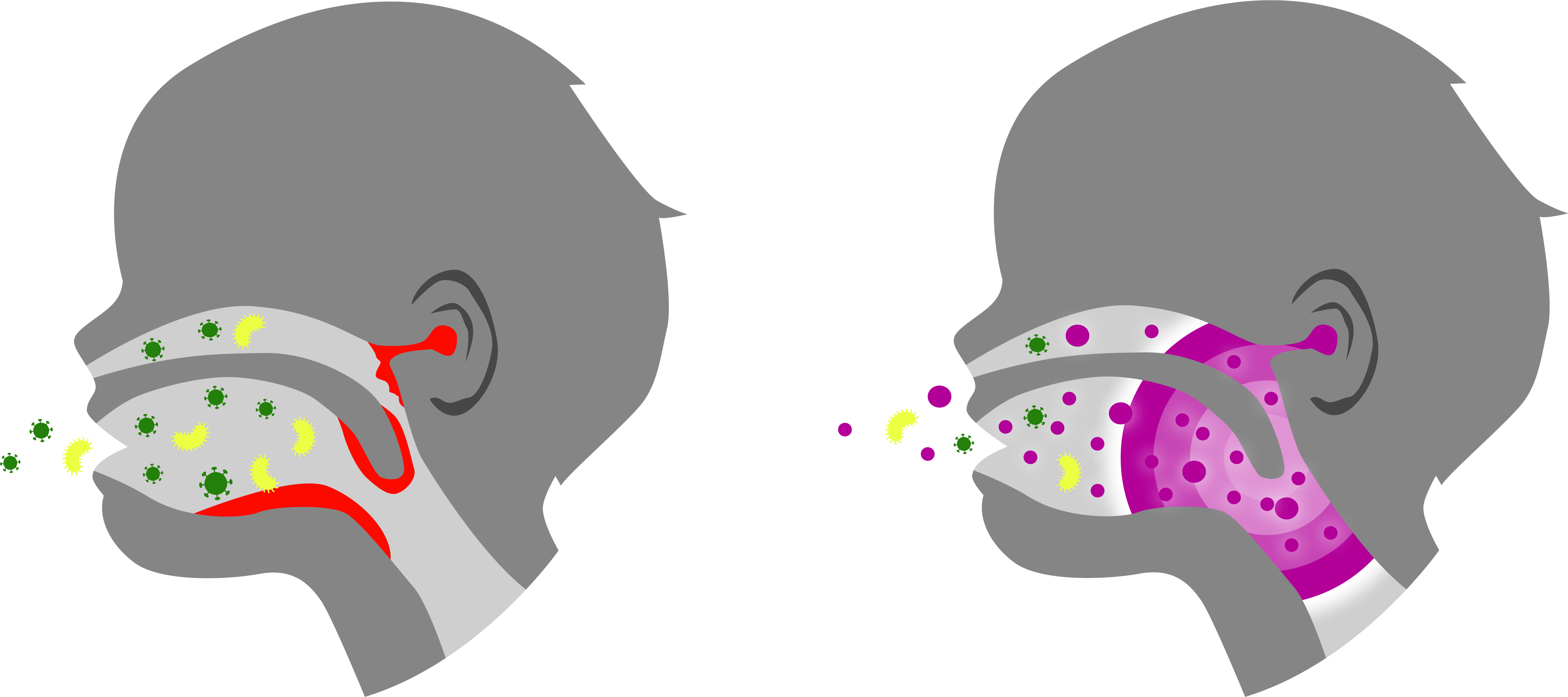 Sind die nützlichen Bakterien der Mundflora reduziert, können sich schädliche Keime ungehindert im Mundraum und von dort weiter ausbreiten (links). Eine große Artenvielfalt des Mundmikrobioms wehrt unerwünschte Keime ab (rechts).