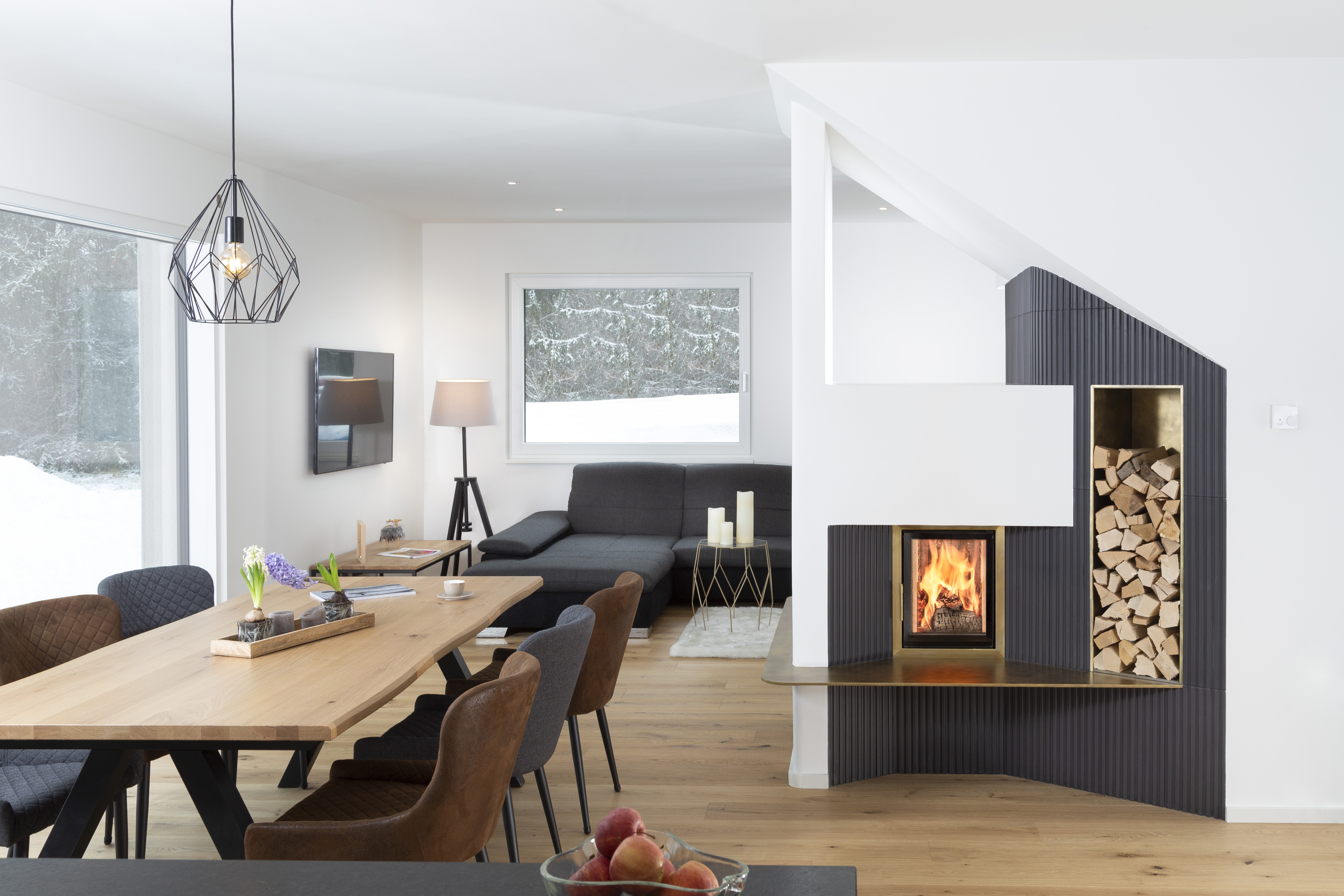 Umgesetzt wurde dieses hochgelobte und ausgezeichnete Projekt in einem offenen Wohnraum, den ein Kachelofen durchdacht positioniert in Wohn- und Essbereich unterteilt. Dabei wirkt er durch die Kombination der ausgewählten Materialien optimal in den Raum integriert und fungiert dennoch als absoluter Blickfang.
