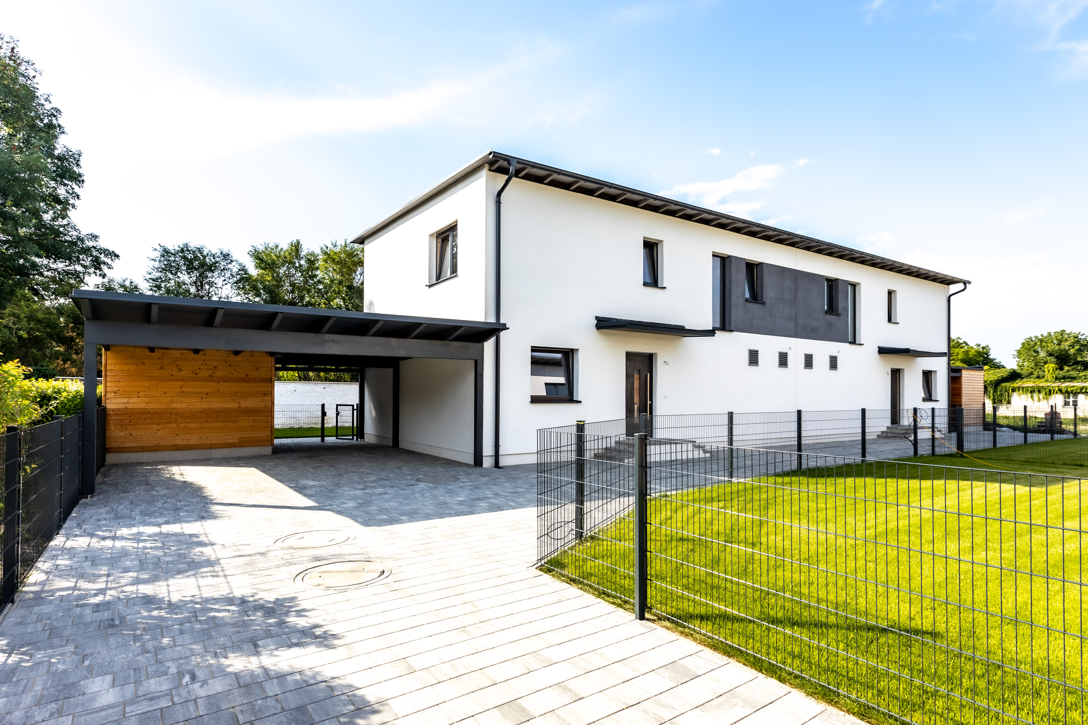 Die zweigeschoßigen Häuser verfügen über eine Gesamtfläche von rund 142 m². Die WohnNatur Niedrigenergie-Naturhäuser verfügen über modernste Ausstattung, wie der umschaltbaren Wärmepumpe, Deckenkühlung, kontrollierter Wohnraumlüftung und Holz-Alu-Fenster mit 3-Scheibenverglasung. Das sonnige Wohnzimmer mit Küchenanschlüssen führt direkt in den angeschlossenen Garten mit Terrasse, welcher den Wohlfühlfaktor noch weiter steigert. Insgesamt stehen von vier noch drei Doppelhaushälften zum Kauf zur Verfügung: Garten- oder Straßenseite: Schlüsselfertig inklusive Carport und Nebengebäude.