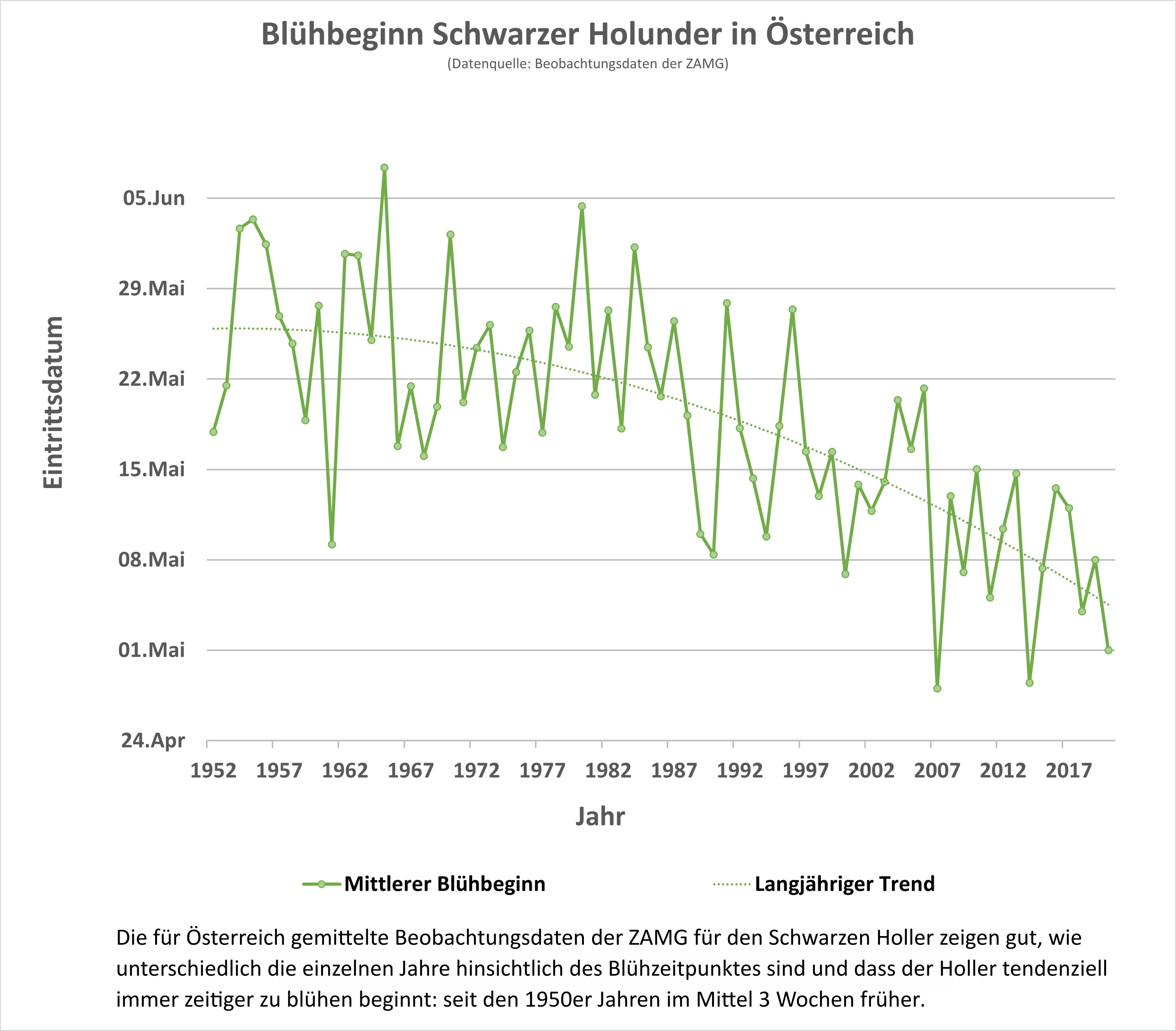 Doppelt so schnell wie im weltweiten Durchschnitt ist die Jahresmitteltemperatur im Alpenraum in den letzten 100 Jahren um etwa 1.8 °C angestiegen. Das wirkt sich auch auf die Pflanzen aus. Der Frühling zieht mit der ersten Blüte oder dem Beginn des Laubaustriebs um etwa 7 bis 10 Tage früher ins Land als noch vor 30 Jahren. Das Laub beginnt sich in manchen Regionen um einige Tage später zu verfärben. Insgesamt hat sich die Vegetationsperiode um bis zu zwei Wochen verlängert.