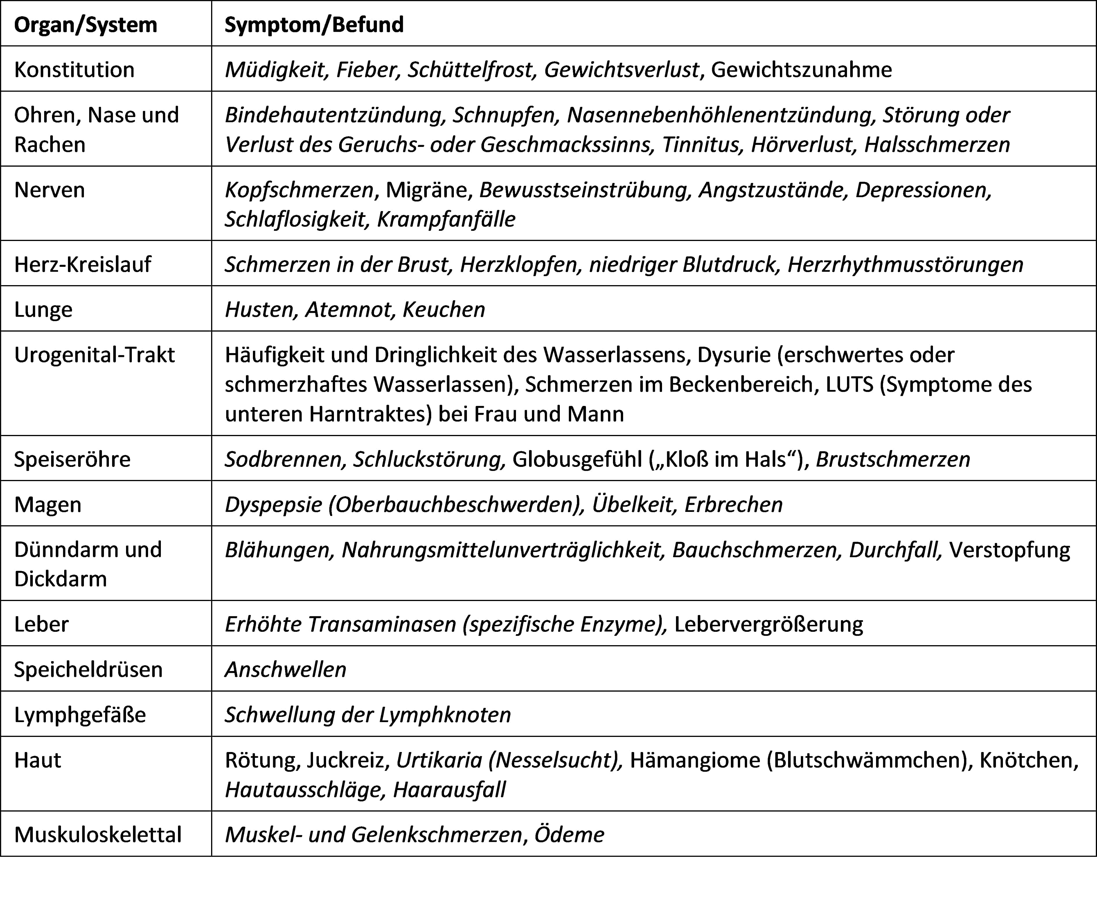 Die Symptome sind unspezifisch und betreffen vor allem die Haut, den Magen-Darm-Trakt, das Herz-Kreislauf-System, die Atemwege und neurologische Systeme, u.a. niedriger Blutdruck, schneller Puls (Tachykardie), Durchfall, Bauchkrämpfe, Übelkeit, Hautrötung, Juckreiz, Nesselsucht, Angioödeme, verstopfte Nase und Kopfschmerzen (Valent, 2013; Frieri, 2018). Die Symptome lassen auch an eine Histaminintoleranz (HIT) denken. Tatsächlich ist eine HIT in den meisten Fällen eigentlich ein Mastzell-Aktivierungssyndrom mit vermehrter Bildung von Histamin durch die Mastzellen.
