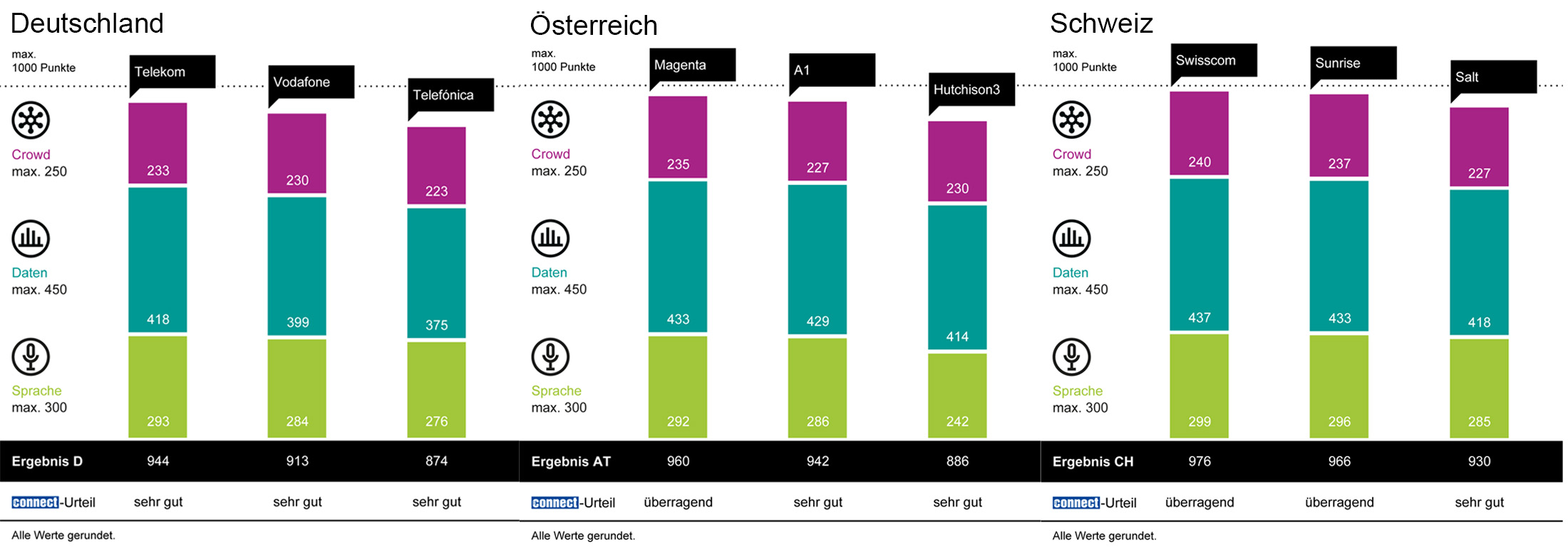 connect und umlaut ermittelten erneut, welche Netzbetreiber in Deutschland, in Österreich und in der Schweiz führend sind (FOTO)