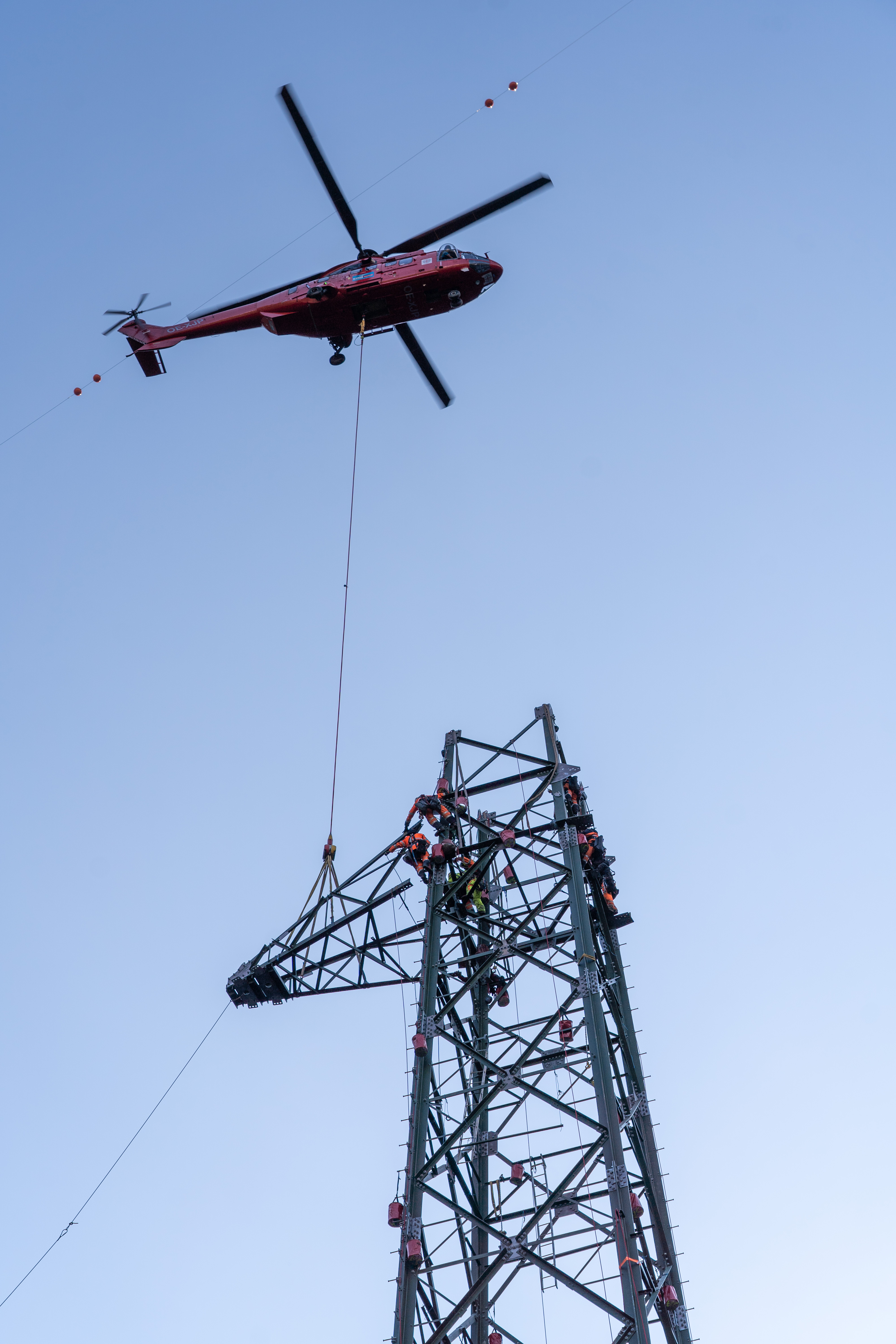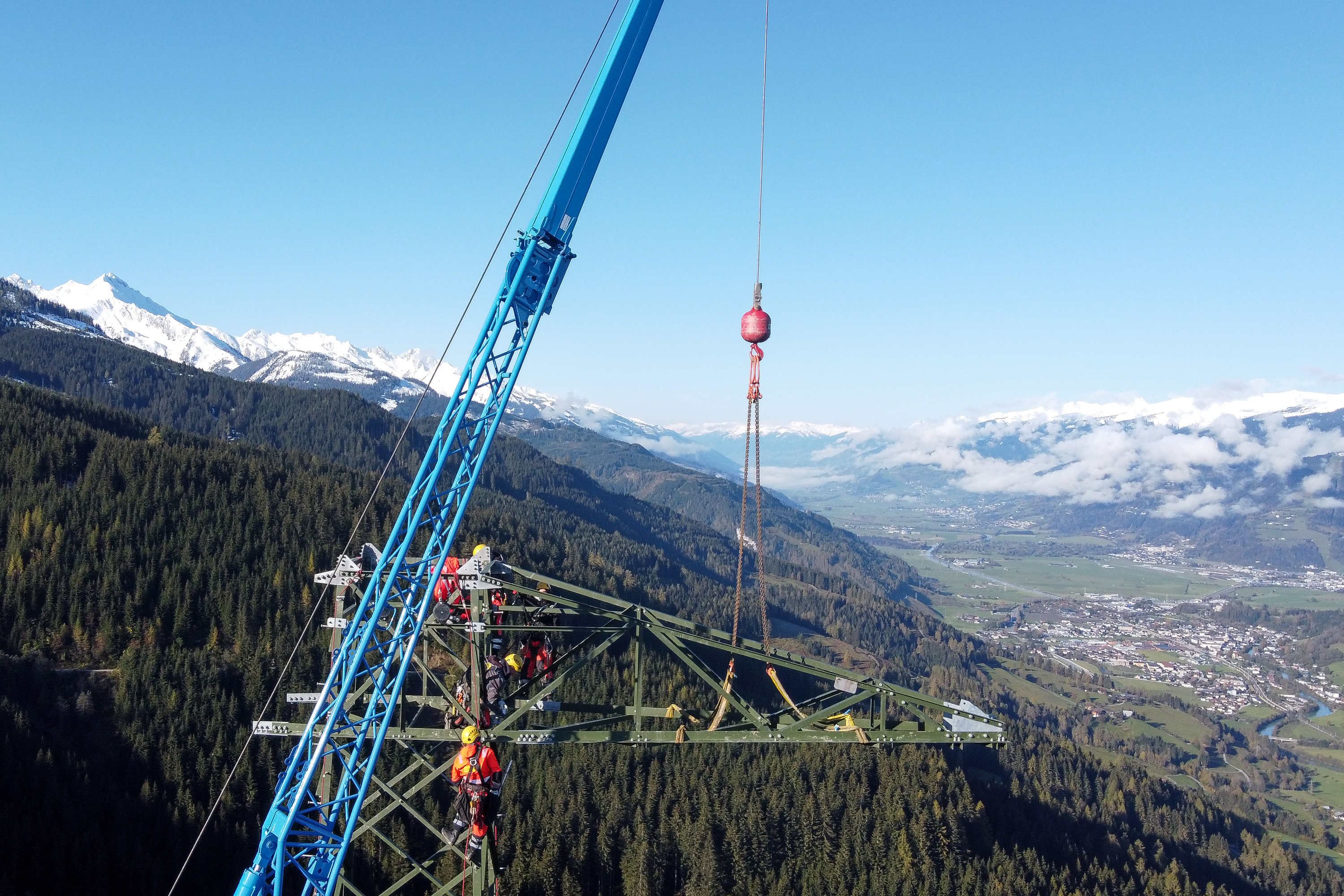 Beeindruckende Aufnahmen von Monteuren in schwindelerregender Höhe, von Helikopter, Autokran, Materialseilbahn & Co.