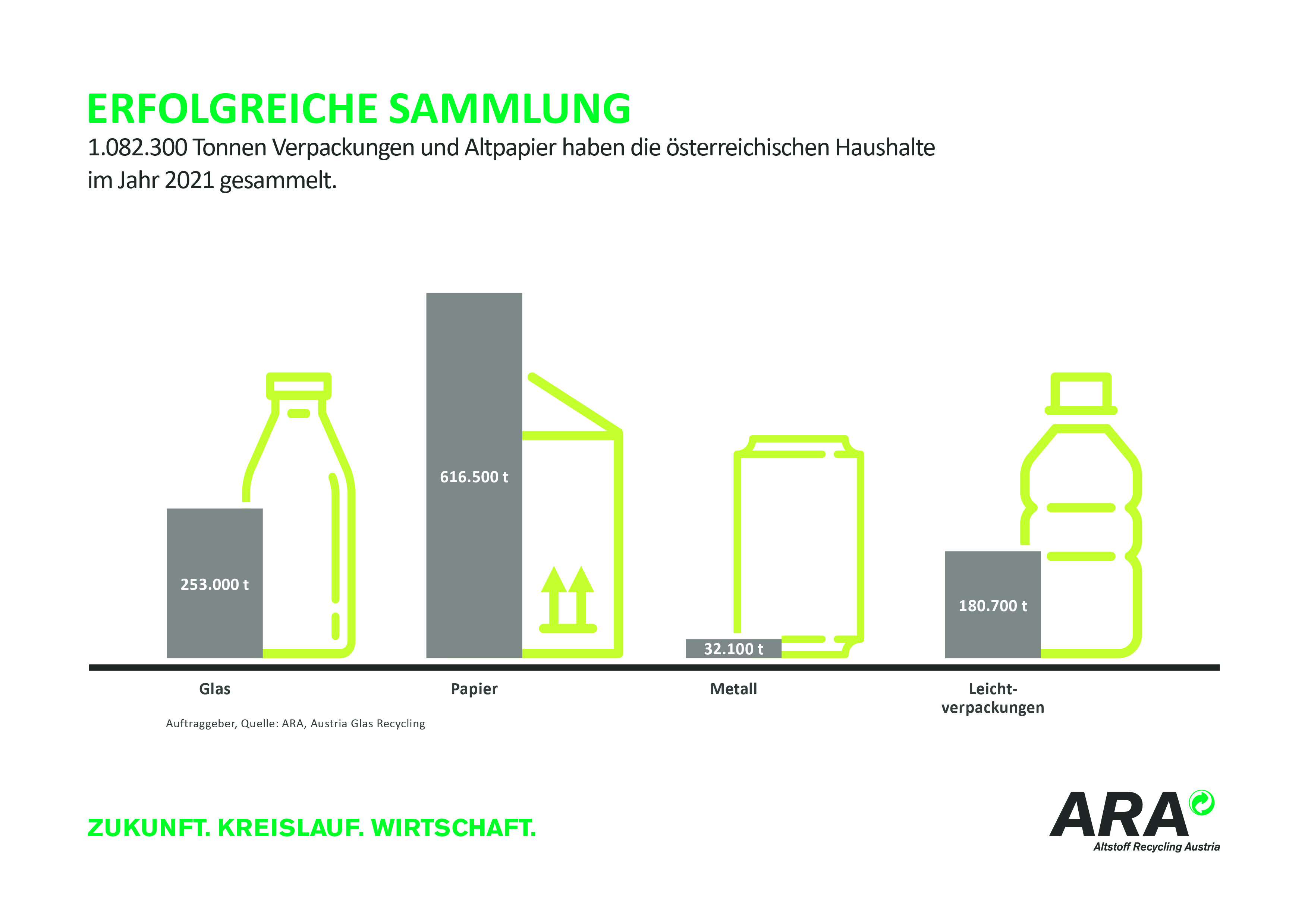 Zukunft. Kreislauf. Wirtschaft. Seit fast 30 Jahren agiert die Altstoff Recycling Austria AG (ARA) als treibende Kraft der österreichischen Abfall- und Kreislaufwirtschaft. Als heimischer Marktführer unter den Sammel- und Verwertungssystemen für Verpackungen sowie Elektroaltgeräte und Batterien organisiert die ARA die Sammlung, Sortierung und Verwertung von Verpackungsabfällen flächendeckend in ganz Österreich. Gesamt stehen den Konsumentinnen und Konsumenten mehr als 1,9 Millionen Sammelbehälter zur Verfügung, zusätzlich sind über 1,8 Millionen Haushalte an die Sammlung mit dem Gelben Sack angeschlossen. Großes Vertrauen und hohe Akzeptanz der Bevölkerung sind neben kontinuierlichem Ausbau kennzeichnend für das ARA Sammelsystem. 2020 sammelten die österreichischen Haushalte 1,08 Millionen Tonnen Verpackungen und Altpapier.