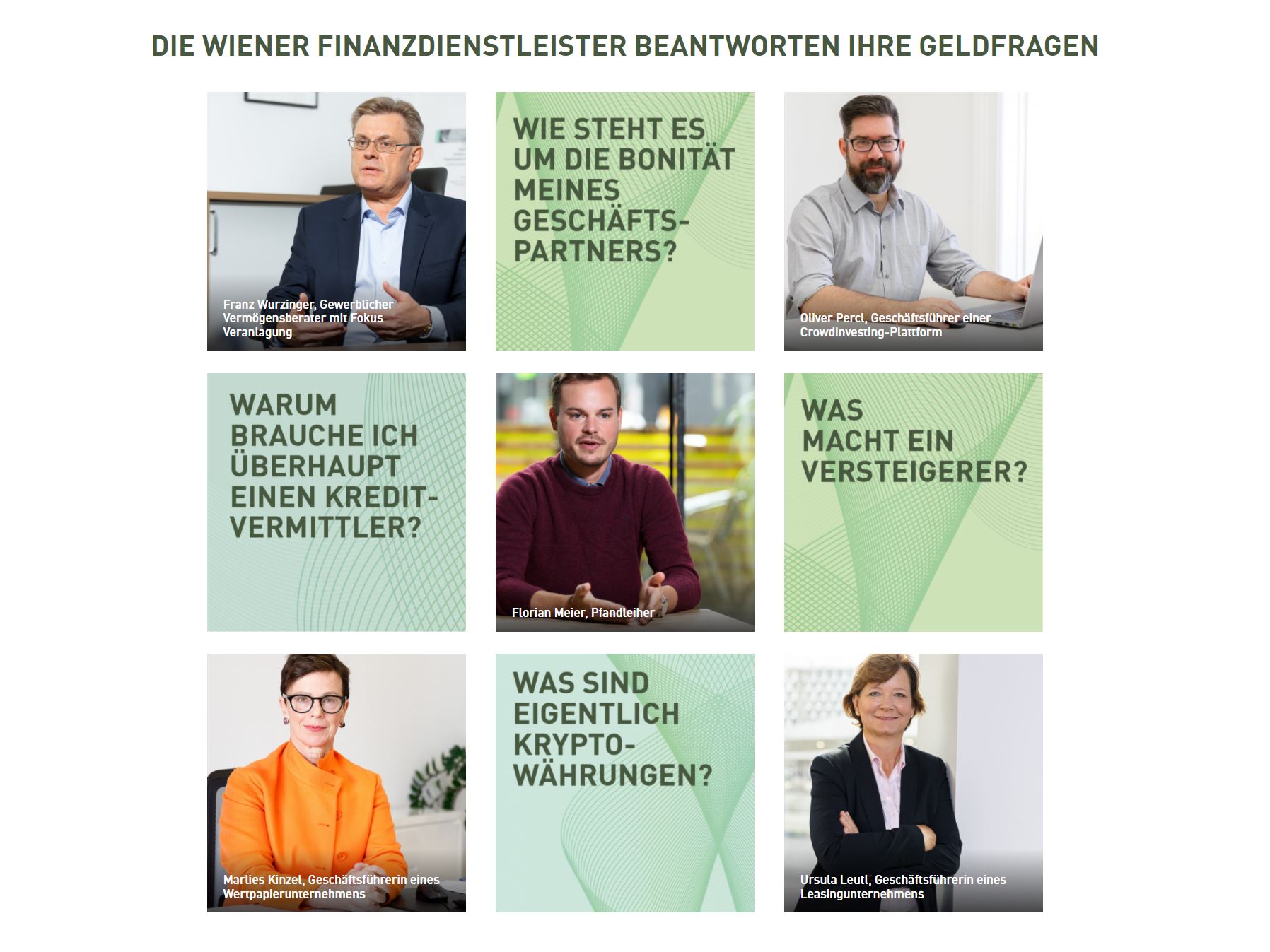 Die Wiener Finanzdienstleister begleiten und unterstützen Privatpersonen und Unternehmen in allen Lebenslagen und Entwicklungsphasen. Egal, ob bei der Suche nach einer maßgeschneiderten Finanzierung für das Eigenheim, das neue Auto oder die neue Produktionsanlage, Anlagemöglichkeiten für den Vermögensaufbau oder die Altersvorsorge, der Einholung von Informationen zur wirtschaftlichen Situation von Kunden und Geschäftspartnern, der Überbrückung kurzfristiger finanzieller Engpässe, dem sicheren und gewinnbringenden Verkauf von Wertsachen oder dem Handel mit digitalen Assets.
