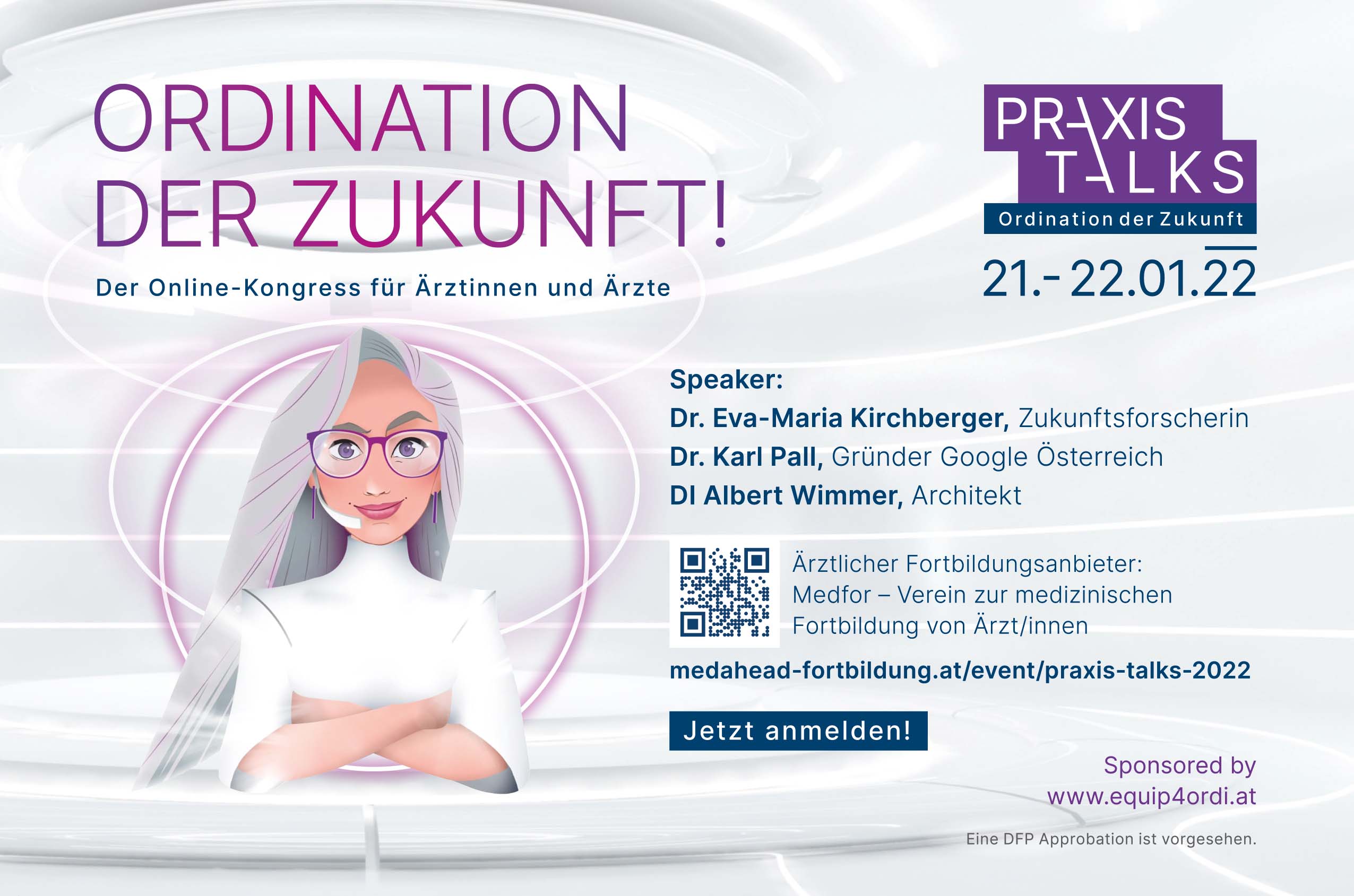 In Zusammenarbeit mit MEDahead und medfor ist eine DFP-Approbation vorgesehen. Die Anmeldung ist unter https://medahead-fortbildung.at/event/praxis-talks-2022 bis zum Veranstaltungstag noch kurzfristig möglich. Diese ist mittels eines Equip4Ordi-Accounts kostenfrei.