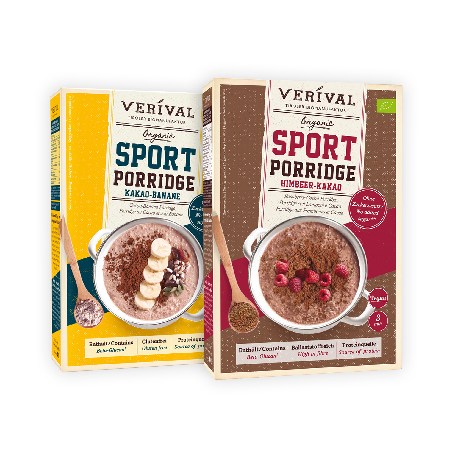 Die Tiroler Biomanufaktur Verival ergänzt ihr Frühstückssortiment um zwei weitere innovative Sport-Produkte. Die beiden Porridges in den Geschmacksrichtungen Kakao-Banane und Himbeer-Kakao stellen aufgrund ihrer Nährstoffverteilung ein ideales Frühstück für SportlerInnen dar. „Warmes Frühstück und speziell unsere Sport Porridge-Hafermischungen stärken den Gesamtorganismus und machen uns so spürbar belastbarer. Ich sehe unsere neuen Porridges ernährungsphysiologisch als perfekte Basisausstattung, um in den Tag zu starten. Ganz gleich welche Ernährungsgewohnheiten sonst verfolgt werden.“, so Verival Eigentümer Wolfgang Fojtl.