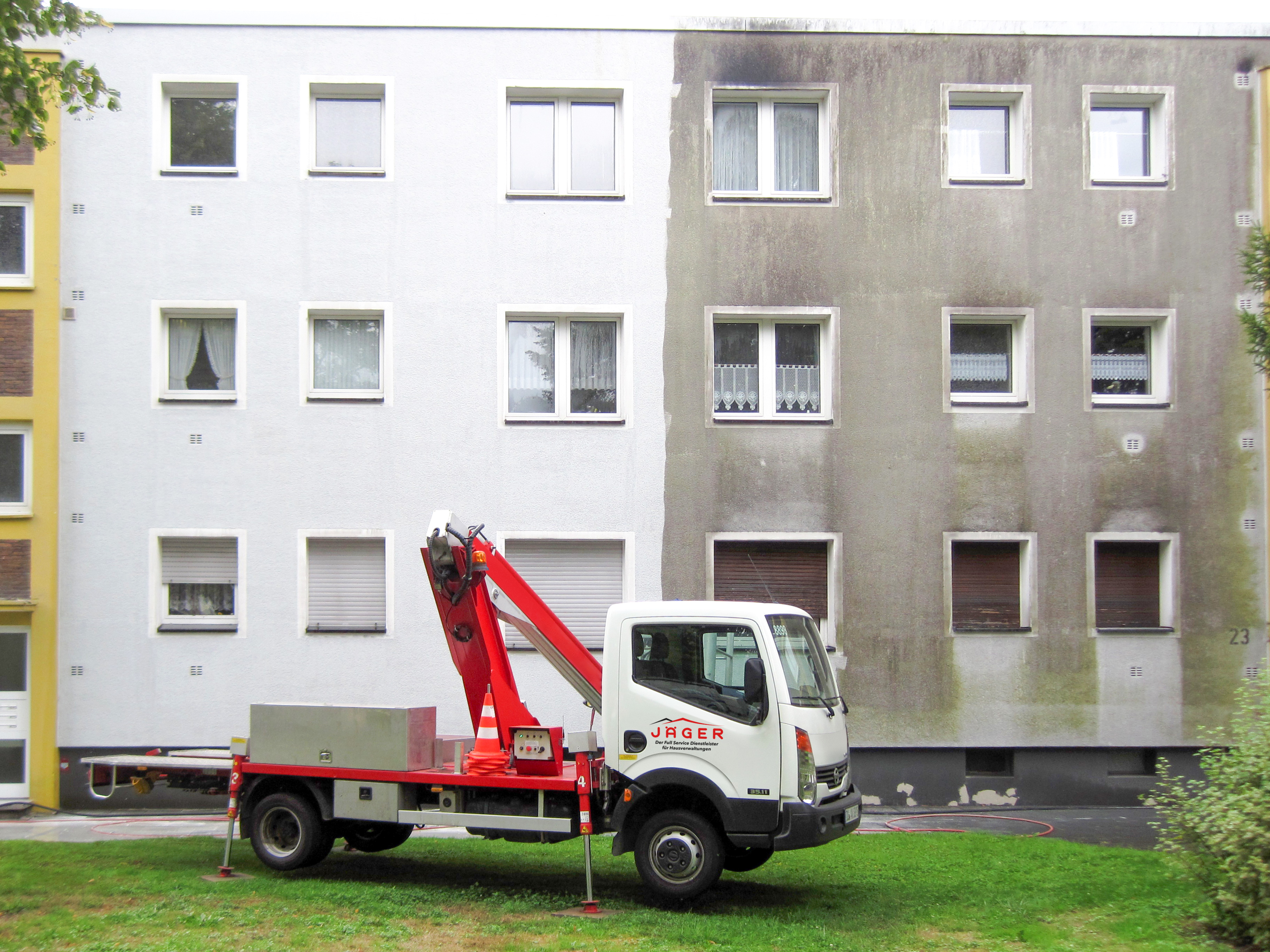 Emissionsrückstände, Staub, Algen und Ruß beeinflussen nicht nur das Außenbild einer Immobilie, sondern schädigen langfristig auch die Bausubstanz. Die professionelle Fassadenreinigung des qualitätsorientierten Immobiliendienstleisters JÄGER bietet eine schonende und umweltfreundliche Reinigung von Außenwänden und sichert gleichzeitig die Werterhaltung der Immobilie.