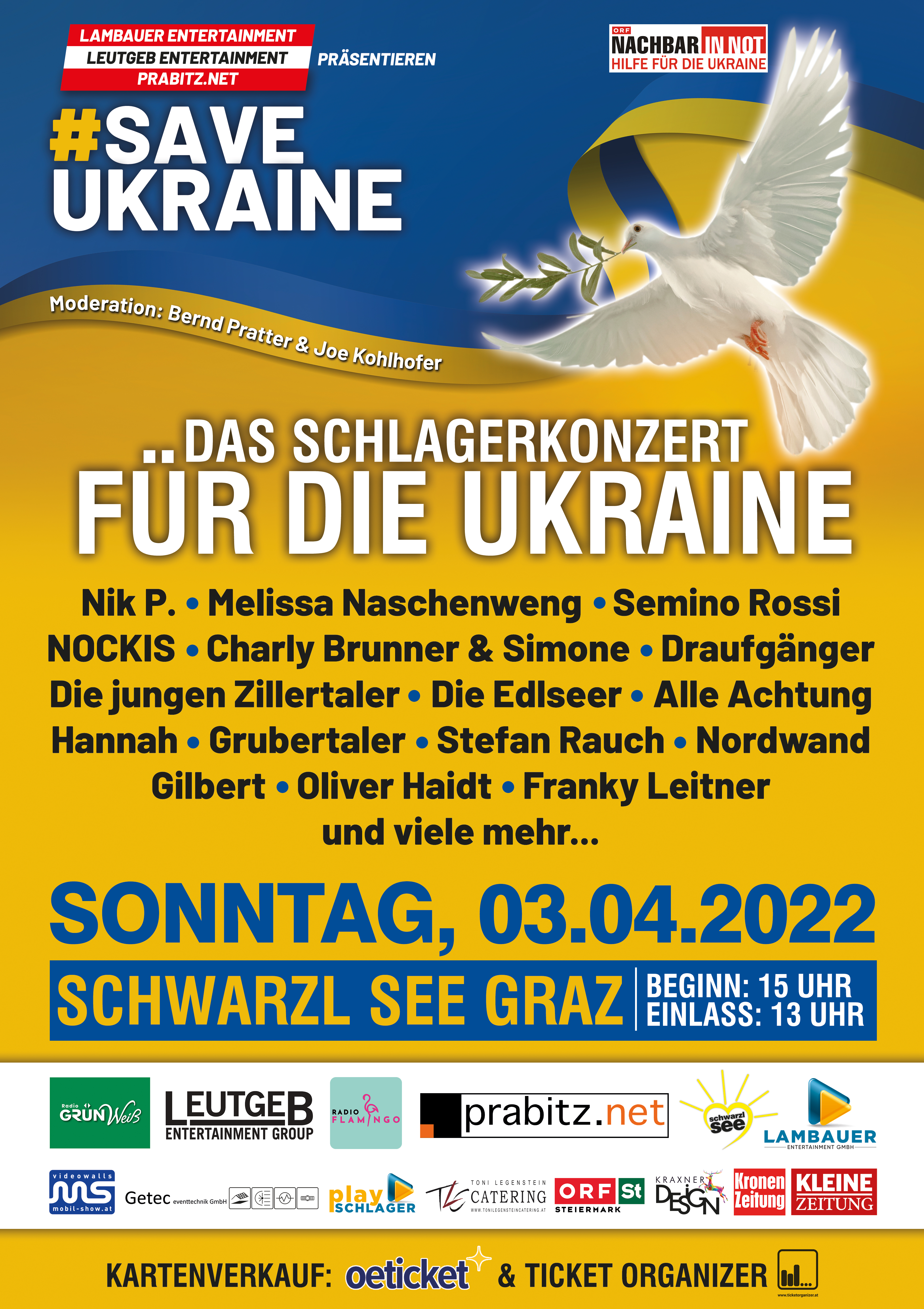 Das Line-up des Schlagerkonzerts für die Ukraine am 3. April 2022 am Schwarzl See listet die großen Namen der heimischen Branche auf: Nik P., Melissa Naschenweng, Semino Rossi, Nockis, Draufgänger, Oliver Haidt, Junge Zillertaler, Die Edlseer, Alle Achtung, Hannah, Die Grubertaler, Charly Brunner & Simone, Stefan Rauch, Nordwand, Gilbert, Franky Leitner und viele mehr. Weitere Künstler werden in den nächsten Tagen bekannt gegeben.