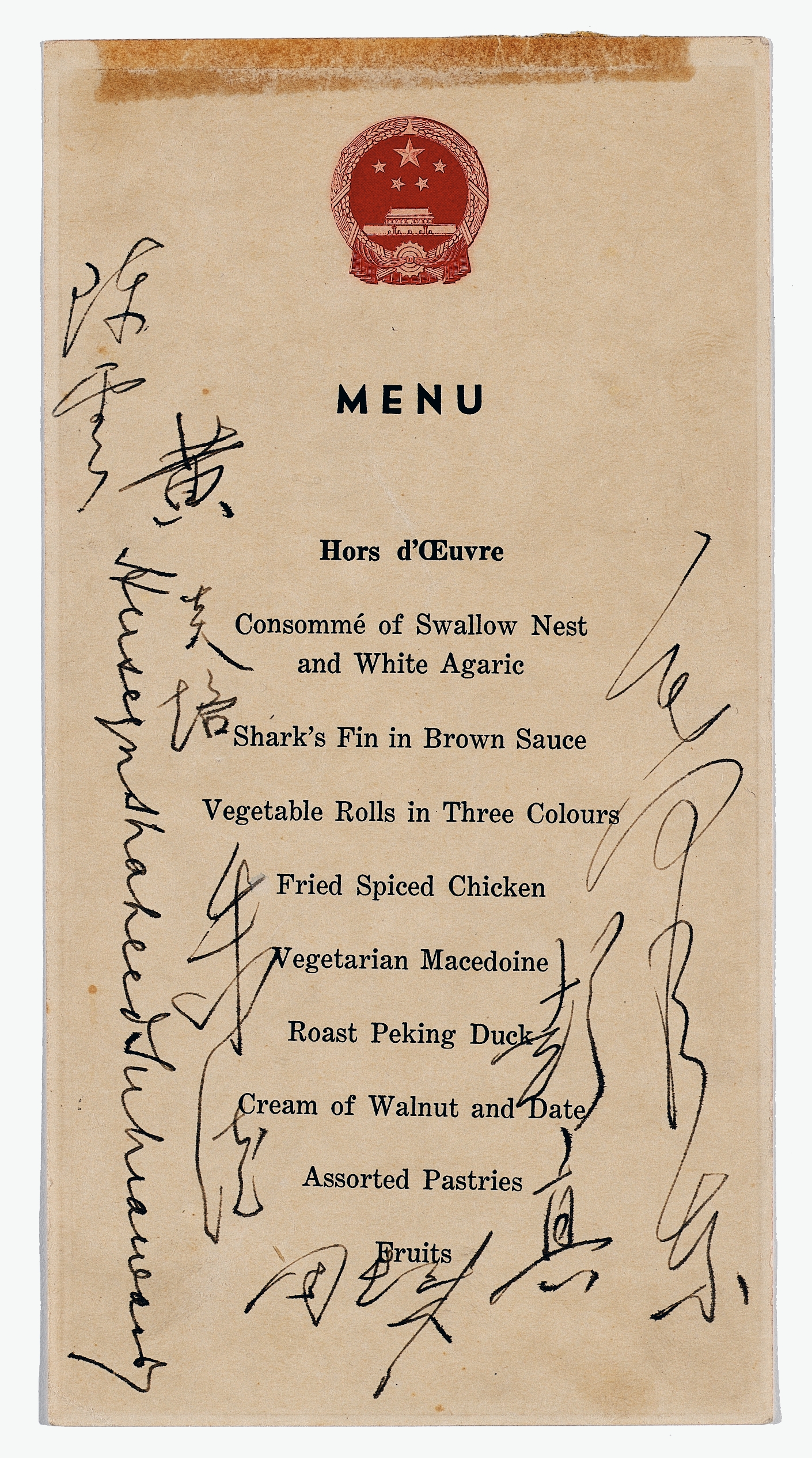 Eine Unterschrift des "Großen Vorsitzenden" Mao Zedong auf einer Menukarte zu einem Pekinger Staatsbankett im Jahr 1956 gehört zu den größten Seltenheiten der bevorstehenden Auktion des Berliner Auktionshauses J. A. Stargardt. Das Bankett fand zu Ehren des pakistanischen Premierministers Suhrawardy statt, zur Speisenfolge gehörten unter anderem Schwalbennestsuppe und Pekingente. Weitere Staatsmänner der ersten Führungsgeneration der Volksrepublik China haben die Karte ebenfalls unterzeichnet. Schätzpreis: 30.000 Euro.