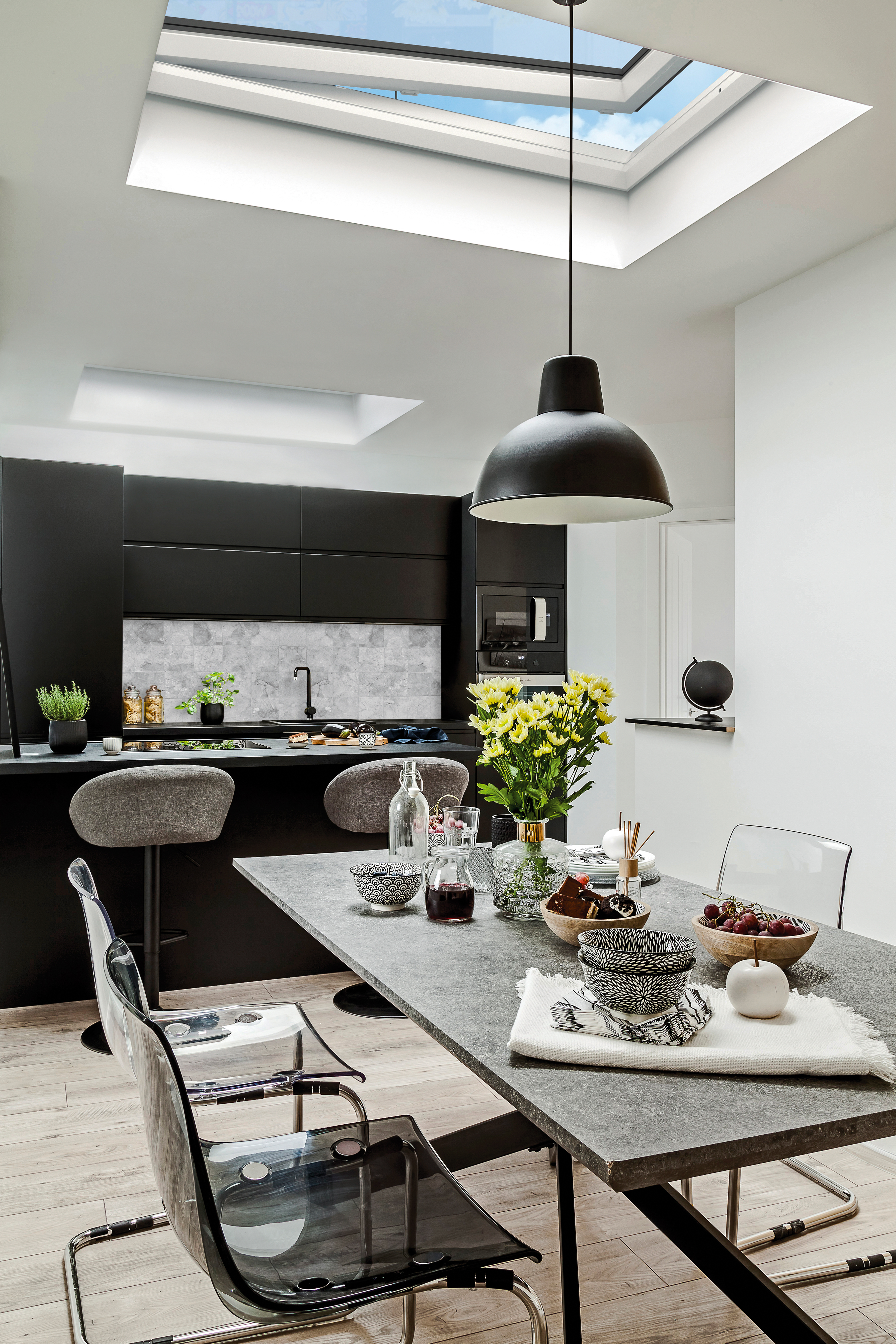 Dabei erfüllt das FAKRO Flachdachfenster DEF Solar alle Ansprüche an Design. Die herkömmliche Kuppel wurde durch eine flache, gehärtete und wärmeisolierte Glasscheibe ersetzt und kann harmonisch in die Gestaltung von Dachterrassen und Flachdächern ab einer Dachneigung von 2° integriert werden. Durch eine spezielle Profilkonstruktion weist das FAKRO DEF Solar Flachdachfenster eine große Verglasungsfläche auf und sorgt für helle und freundliche Innenräume.