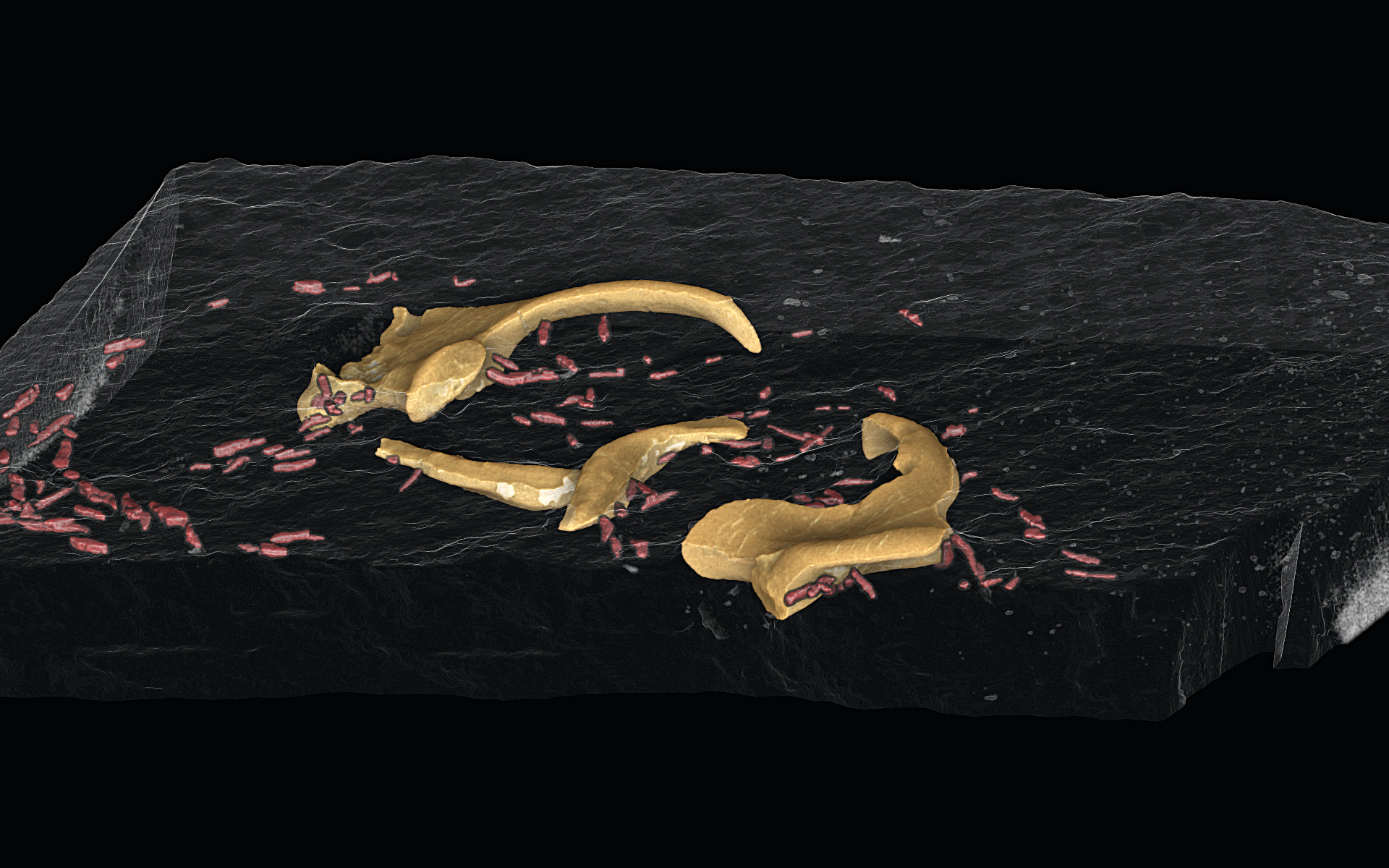 Mit Hilfe dieser Micro-CT-Aufnahmen konnte erstmals in das Innere der Gebilde geblickt werden. So entstanden Bild um Bild digitale 3D-Modelle der fossilen Reste, die von unzähligen, sich verzweigenden Gängen durchzogen waren. Die chemische Zusammensetzung konnte zusätzlich durch feinste Gesteins-Dünnschliffe mit Hilfe von Rasterelektronen-Mikroskopie und hochauflösender Materialanalyse bestimmt werden. Die Objekte bestehen aus reinem Kohlenstoff. Rund um die Funde sind hunderte Fanghäkchen von Tintenfisch-Armen eigebettet und auch Schulpe (die kalkigen Schalen der Weichtiere) fanden sich in der Nähe der Strukturen.