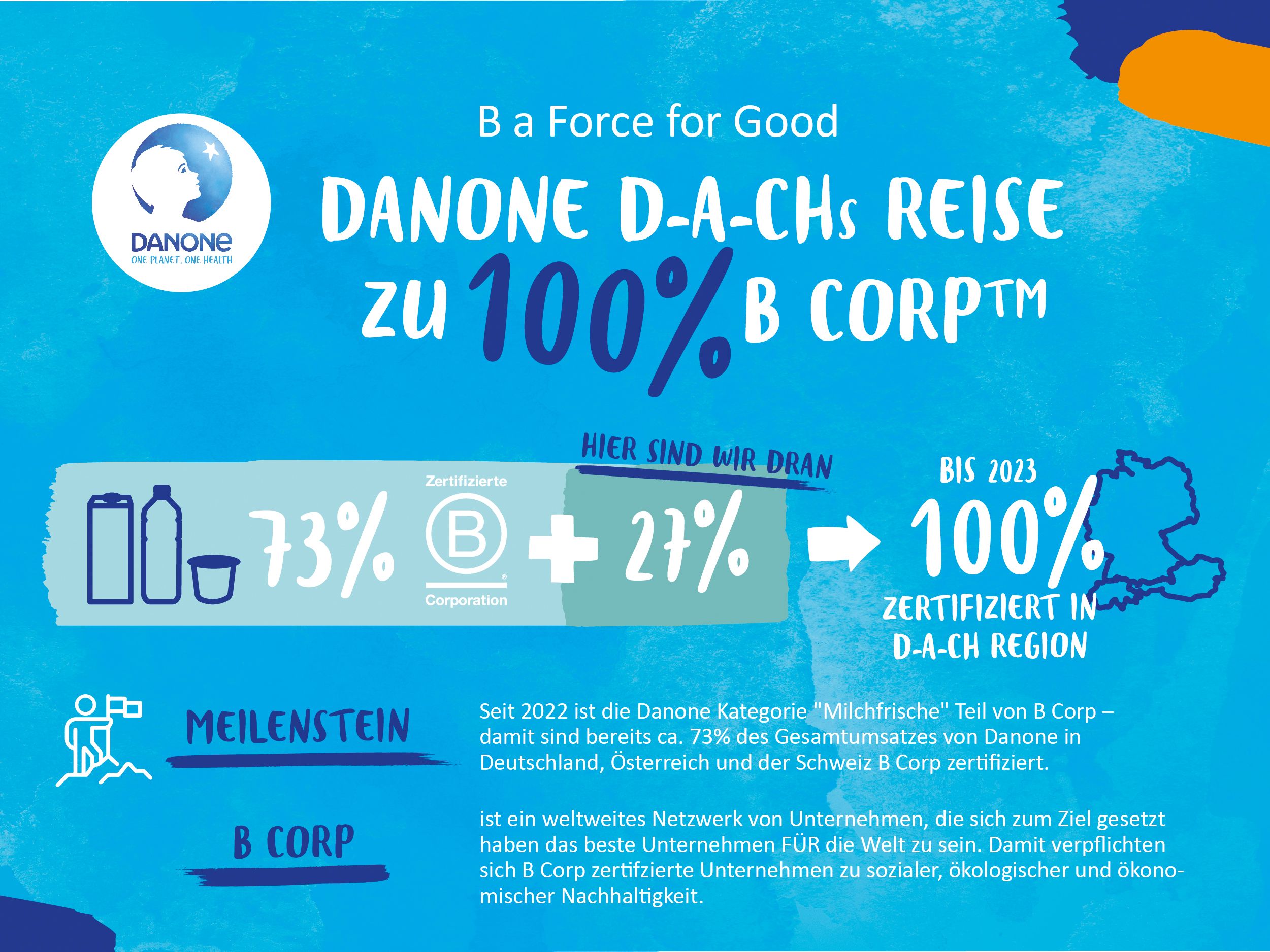 “, erklärt Stefan Stohl, Leiter der Unternehmenskommunikation bei Danone DACH. „Wir wollen B Corp als einer der großen Vorreiter im deutschen Sprachraum bekannter und relevanter machen und als immer stärker werdende Bewegung den Wandel hin zu einer nachhaltigen Zukunft erfolgreich gestalten. B Corps geht es nicht darum das beste Unternehmen der Welt, sondern das beste Unternehmen für die Welt zu sein