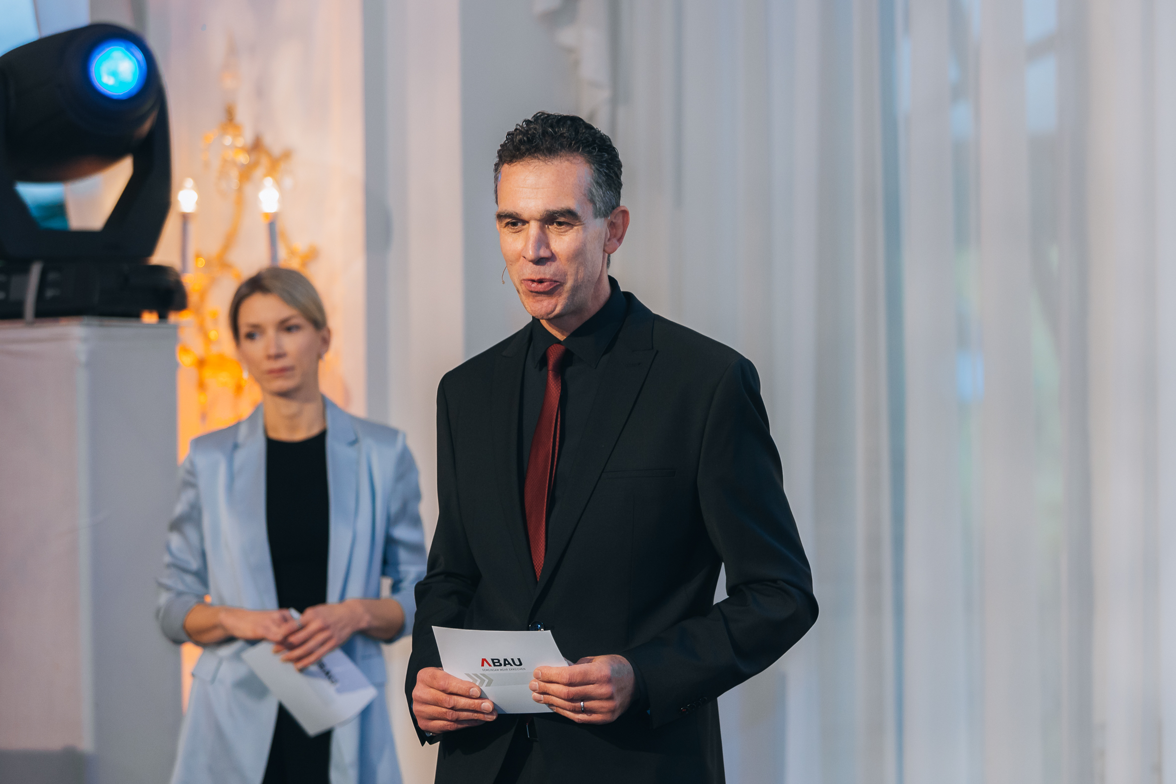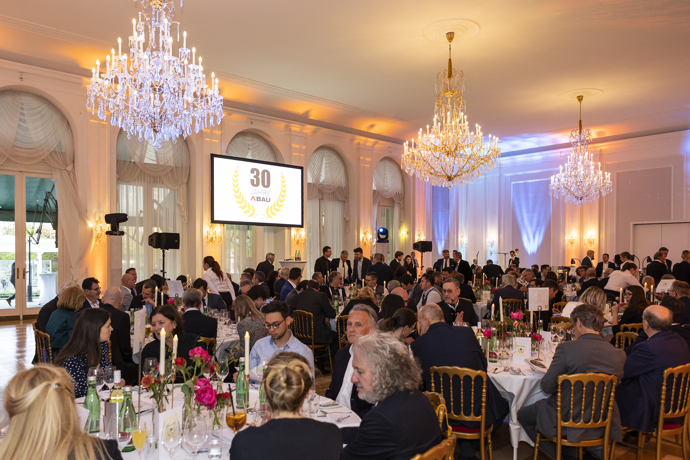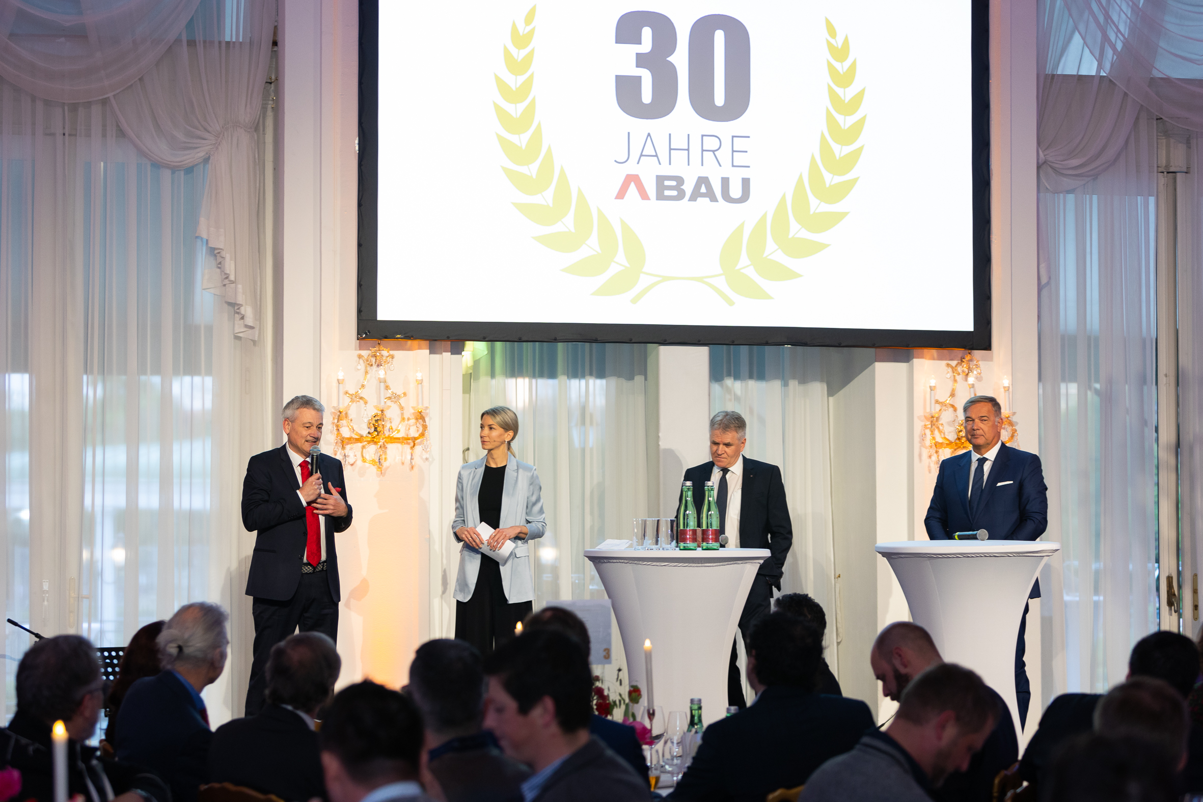 Auf der Bühne erinnerte man sich gemeinsam an die Highlights aus 30 Jahren Austria Bau und blickte, neben den Vertretern der ABAU-Betriebe, mit wichtigen Partnern und Ehrengästen wie u.a. Dipl.-Ing. Walter Ruck, Präsident der Wirtschaftskammer Wien und ABAU-Mitglied, ABAU Vorstands-Obmann BM Ing. Wolfgang Kiss, Bundesinnungsmeister und ABAU-Mitglied BM Ing. Robert Jägersberger, auf die aktuellen Herausforderungen der Branche. Moderatorin Constanze Weiss führte die rund 150 geladenen Gäste charmant durch den Abend. Entertainer Otmar Kastner, der selbst aus der Wirtschaft kommt, verknüpfte Business mit Kabarett. Er entzündete ein Feuerwerk der Begeisterung mit seiner Performance und ließ bei den Gästen die Qualitäten von Leichtigkeit, Mut und Umsetzungskraft lebendig werden.