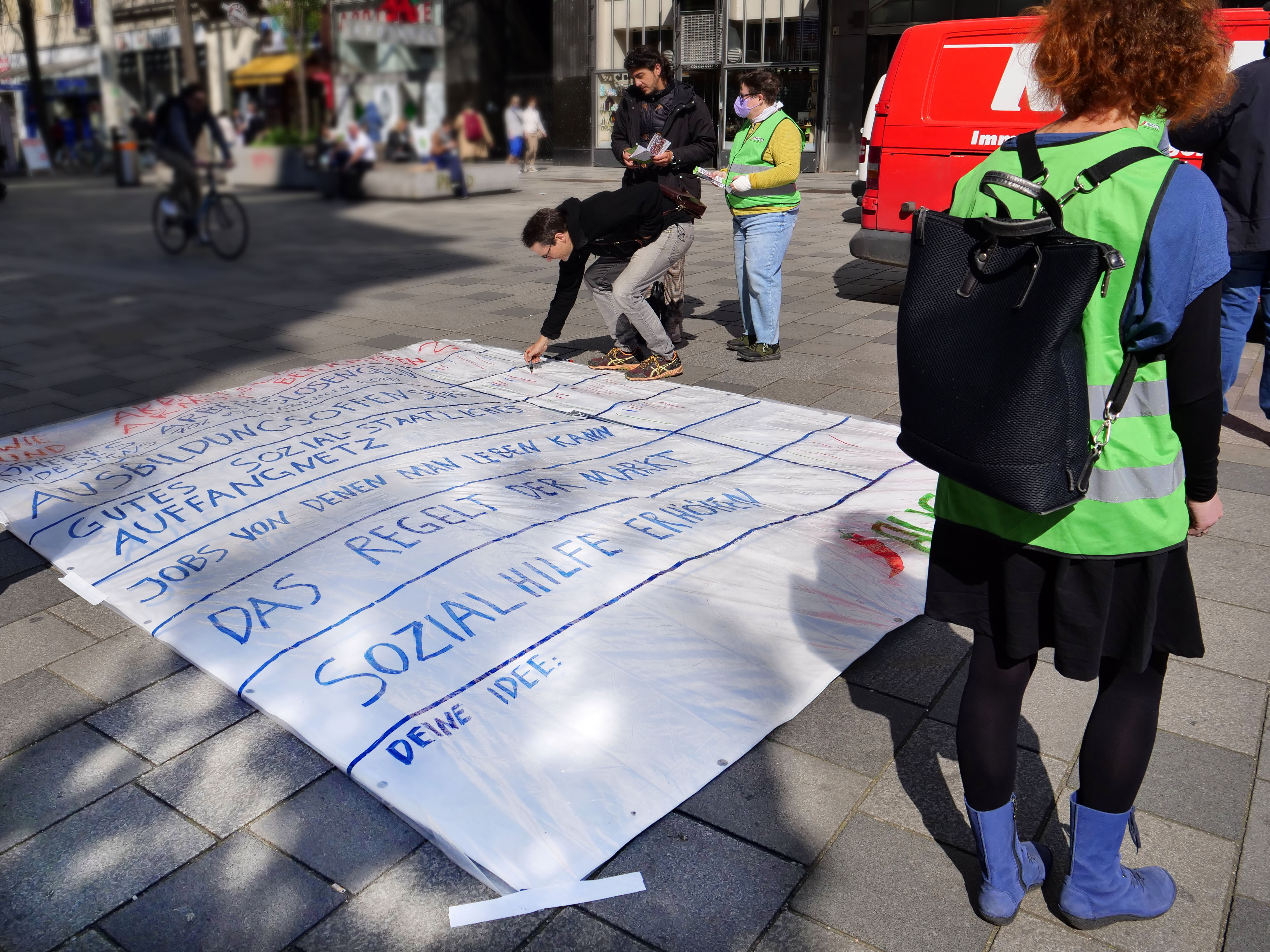 Gestern Vormittag diskutierte die AUGE/UG mittels einer großen Straßen-Bodenumfrage was Arbeitslosigkeit konkret für die Betroffenen bedeutet. Dabei wurde auf die schwierige Situation arbeitsloser Menschen aufmerksam gemacht. „Eine Erhaltung des Lebensstandards nimmt Druck von arbeitslos gewordenen Menschen und trägt damit auch zur Bekämpfung von Lohn- und Sozialdumping bei“, so Vera Koller, Landessprecherin der AUGE/UG Wien. Ausbeuterische Jobs, die unter Druck angenommen werden, haben Auswirkungen auf uns alle.