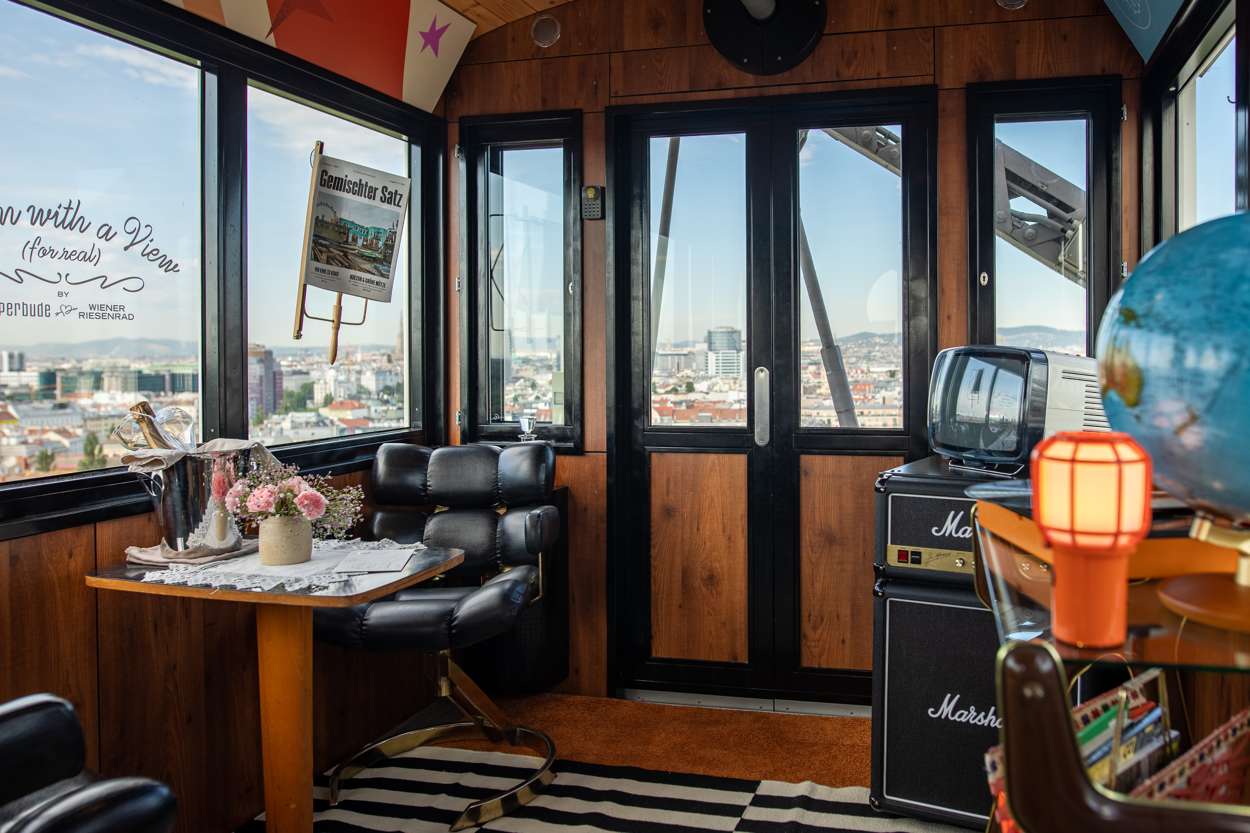 Riesenrad statt Hamsterrad – die Einrichtung des „Room with a View (for real)“-Waggons vereint die Welten des Wiener Riesenrades und der Superbude. So trifft die Grande Dame des Praters auf das neue junge Hotel aus der Perspektivstraße: Der Traum vom Fliegen, Abenteuerlust und Pioniergeist bilden die Schwerpunkte der Gestaltung der Superbude, wodurch sich natürliche Brücken zwischen den zwei Locations und Erlebnissen ergeben. Auf den 10m² des Waggons 28 werden diese final zusammengeführt und eine eigene Welt erschaffen. Ein Ort, der das Gefühl des Fehlens der Zeit vermittelt. Und so vertraut, als ob der beste Freund oder die beste Freundin einem gerade die Schlüssel für die eigene Wohnung übergeben hätte.