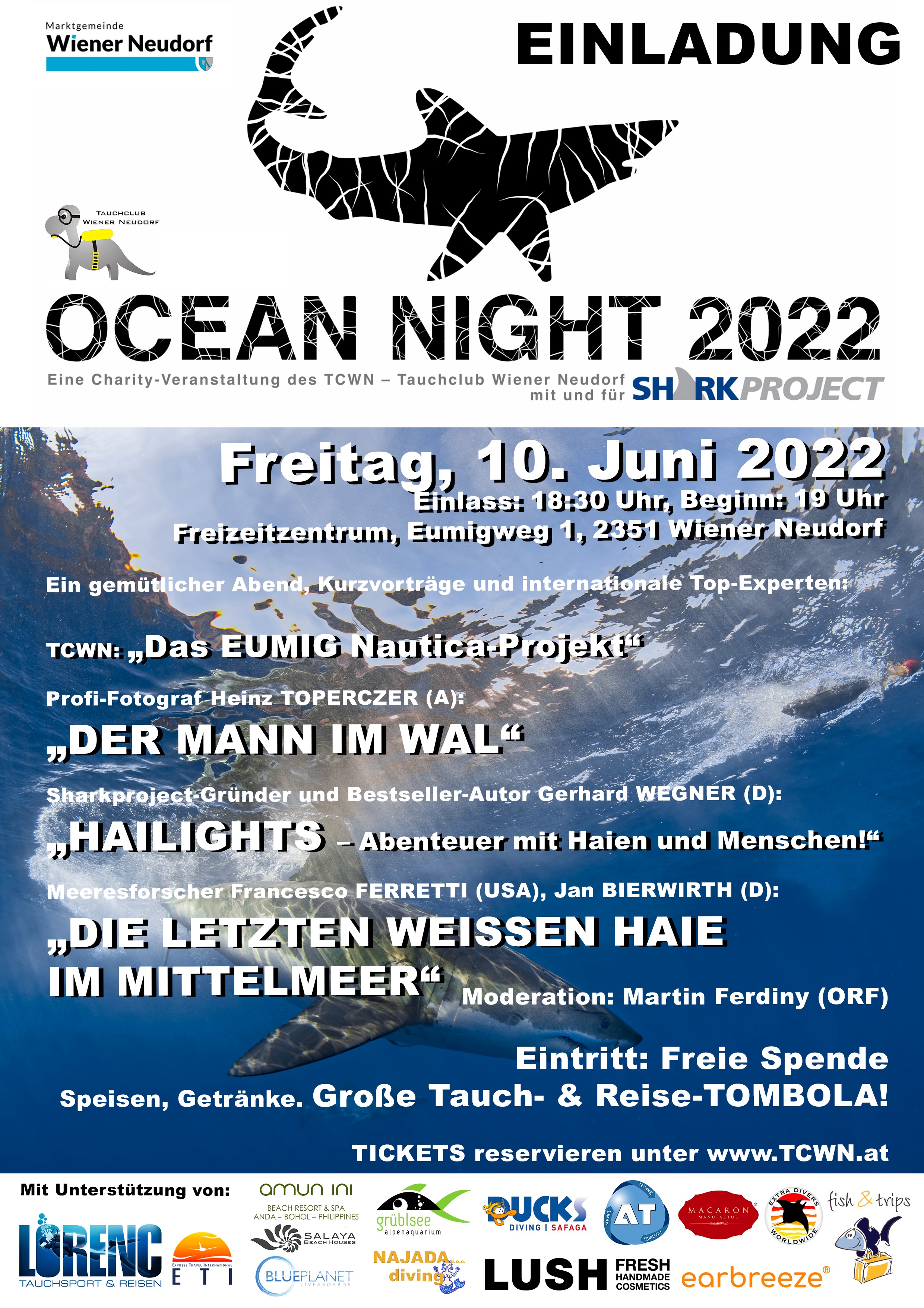 Ein Fixtermin für die österreichische Taucherszene und alle Menschen, die an Meeres- und Artenschutz interessiert sind: Die größte Charity-Veranstaltung für Meeres- und Artenschutz in Österreich findet am Freitag, 10. Juni 2022, im Freizeitzentrum Wiener Neudorf (Bezirk Mödling, NÖ) statt. Sie wird vom Tauchclub Wiener Neudorf (www.tcwn.at) gemeinsam mit der international tätigen Meeres- und Artenschutzorganisation Sharkproject (www.sharkproject.org) organisiert. Ziel der Veranstalter ist es, allen Interessierten den Kontakt mit internationalen Top-Experten zu ermöglichen und gemeinsam Geld zur Finanzierung von Meeres- und Artenschutzprojekten zu sammeln.
